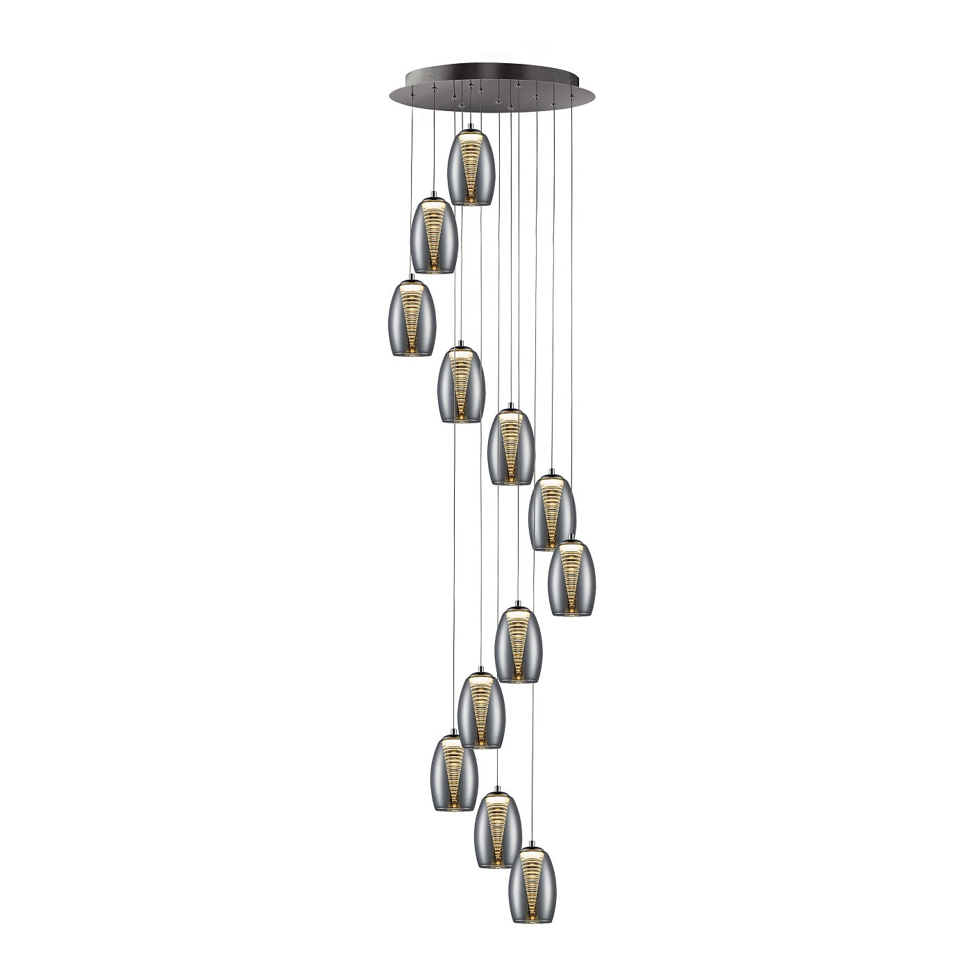 Подвесной светильник с 12 лампами LED, из металла с покрытием "хром". Двойной абажур: внешний - из зеркального стекла, внутренний - из прозрачного поликарбоната в форме конуса, с регулируемой высотой, 12 х 5W LED, 3000 K.