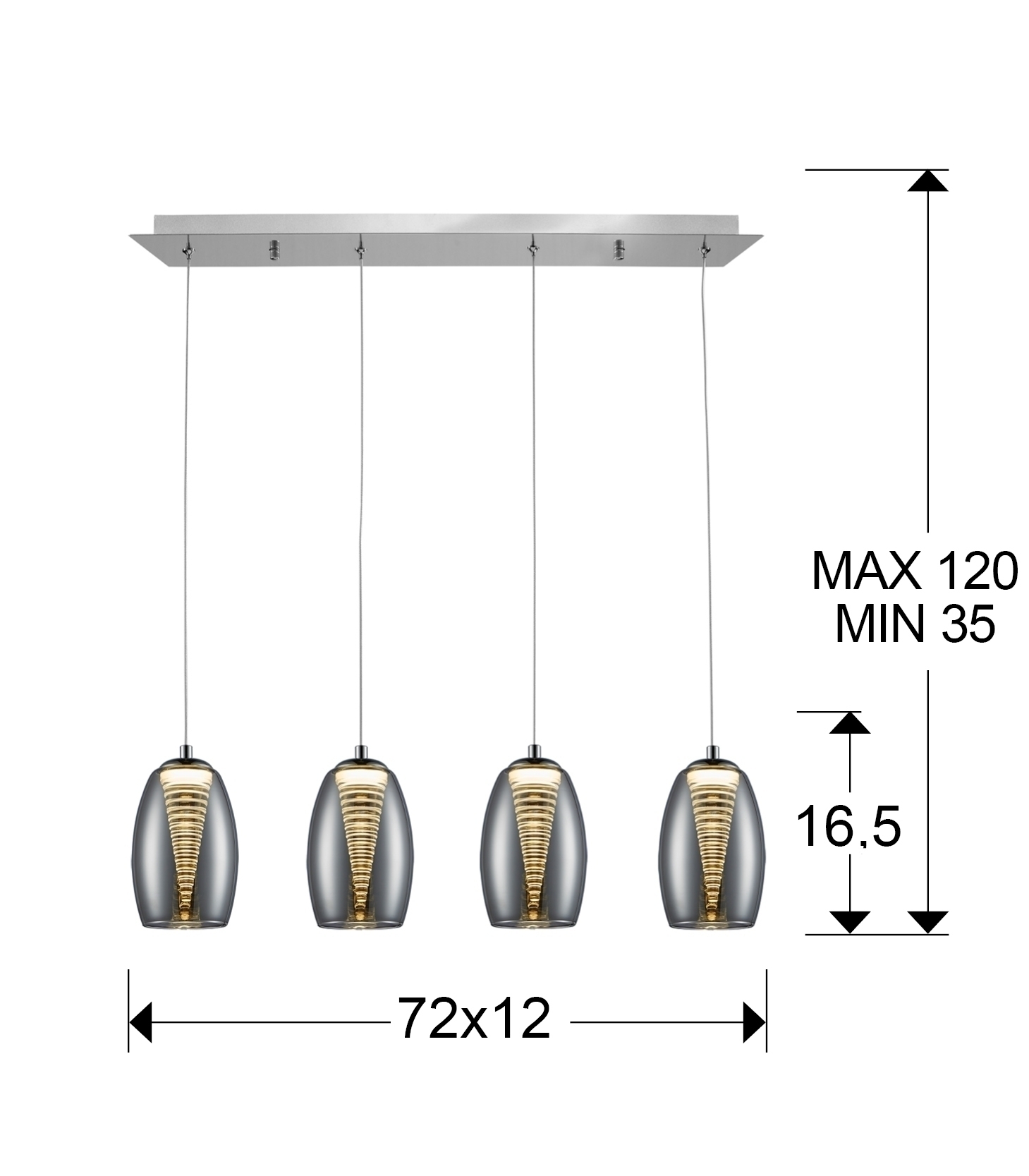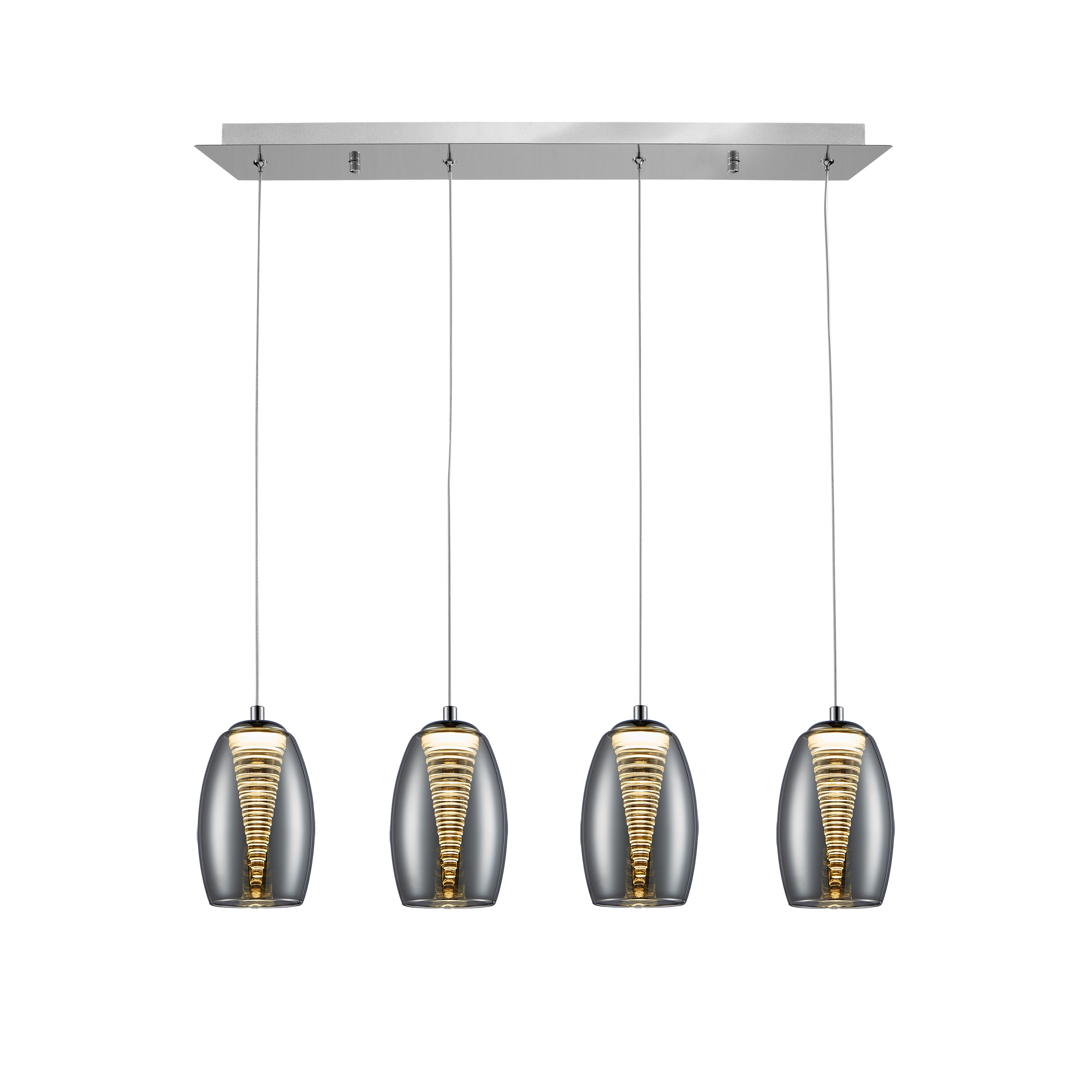 Подвесной светильник с 4 лампами LED, из металла с покрытием "хром". Двойной абажур: внешний - из зеркального стекла, внутренний - из прозрачного поликарбоната в форме конуса, с регулируемой высотой, 4 х 5W LED, 3000 K.