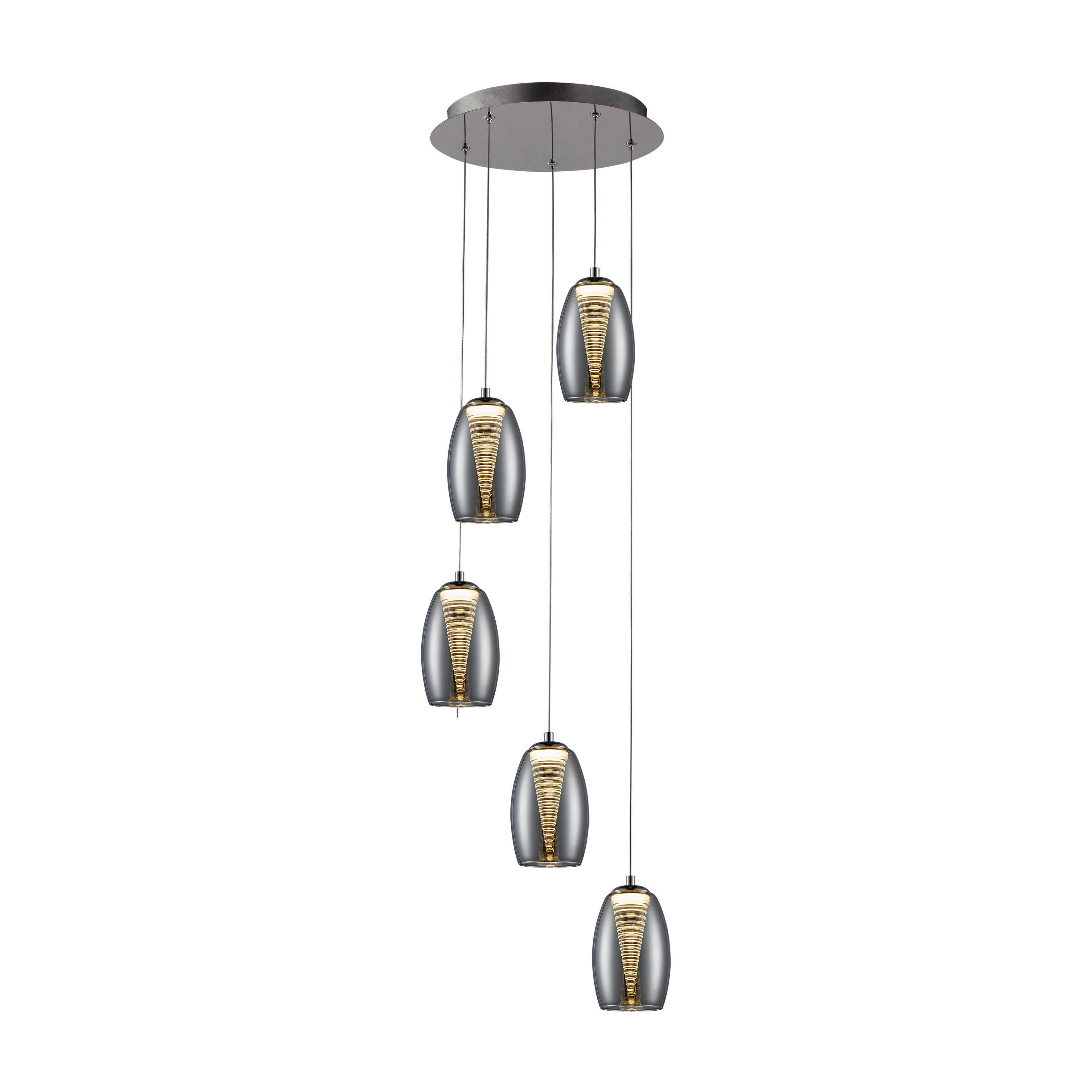 Подвесной светильник с 5 лампами LED, из металла с покрытием "хром". Двойной абажур: внешний - из зеркального стекла, внутренний - из прозрачного поликарбоната в форме конуса, с регулируемой высотой, 5 х 5W LED, 3000 K.
