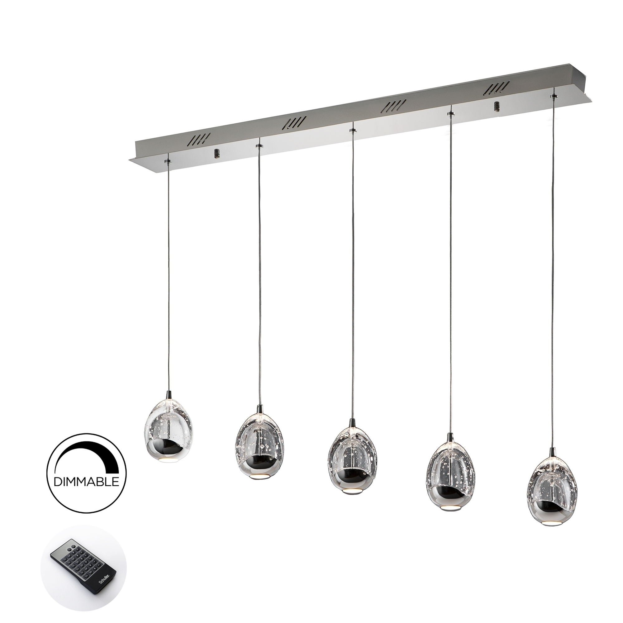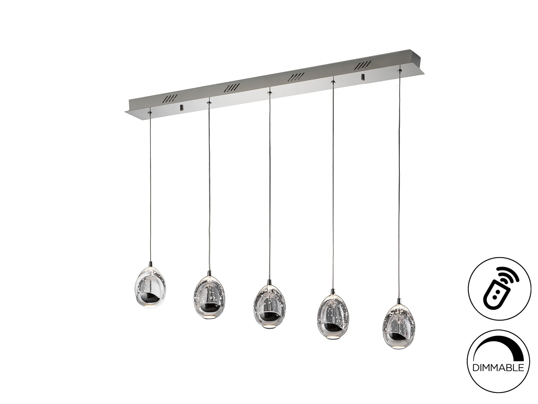 Подвесной светодиодный светильник из металла с покрытием "хром" DIMMABLE. Плафоны в форме капли из массивного стекла с декоративными пузырьками внутри, с регулируемой высотой. 25W LED. 3.250 lm. 2.400 K. DIMABLE. Этот продукт включает драйверы светодиодов с диммером 0-10 В или ШИМ, приемник и радиочастотный пульт дистанционного управления. Для использования с настенным регулятором используйте только диммеры этих двух типов регулирования. Диммер другого типа может повредить драйвер светодиода.