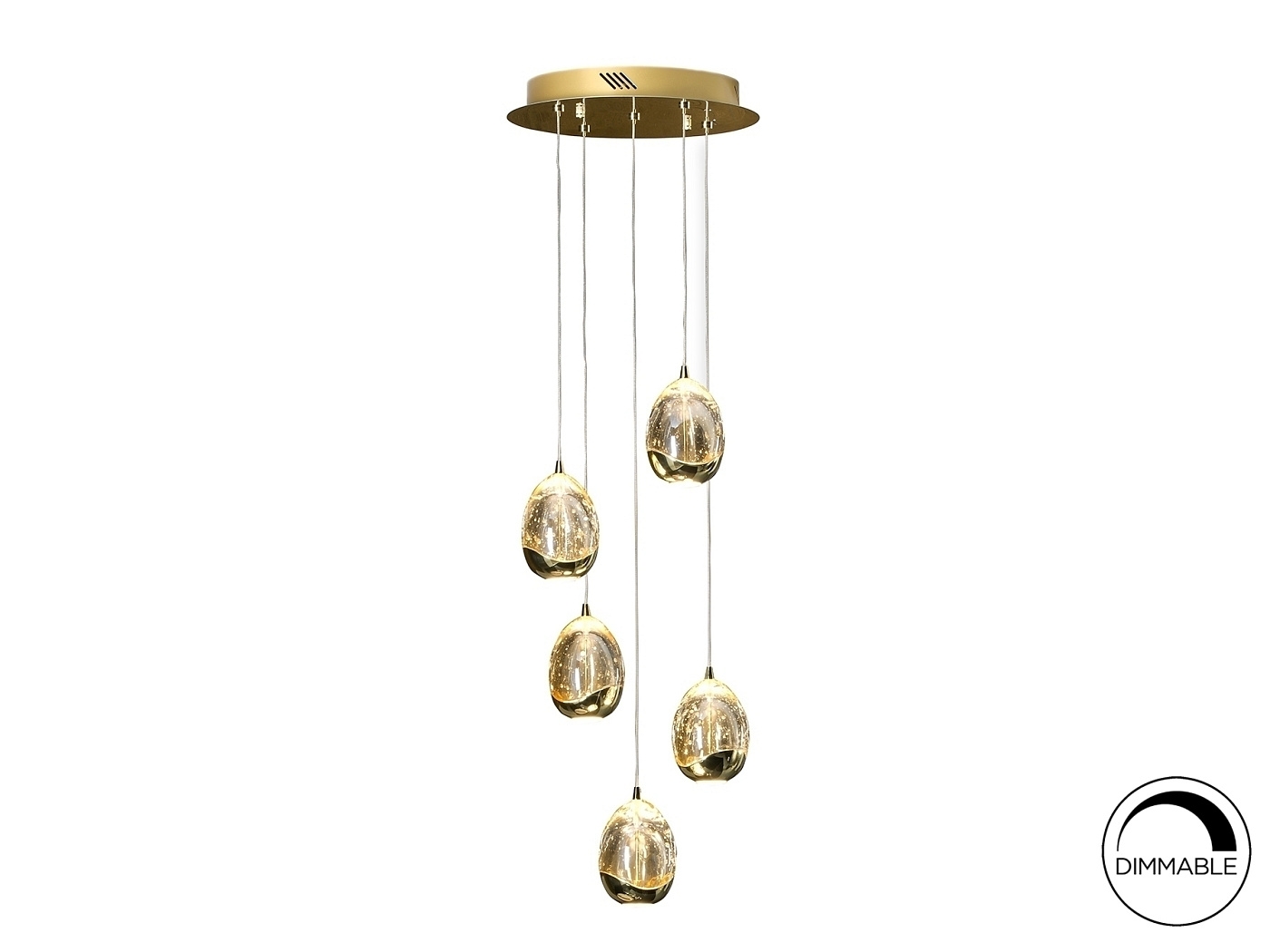 Подвесной светодиодный светильник из металла с покрытием "золото", плафоны в форме капли из массивного стекла с декоративными пузырьками внутри, с регулируемой высотой. 25W LED. 2.400 lm. 3.000 K. Диммируемый. Этот продукт включает драйверы светодиодов с диммером 0-10 В или ШИМ. Для использования с настенным регулятором используйте только диммеры этих двух типов регулирования. Диммер другого типа может повредить драйвер светодиода.