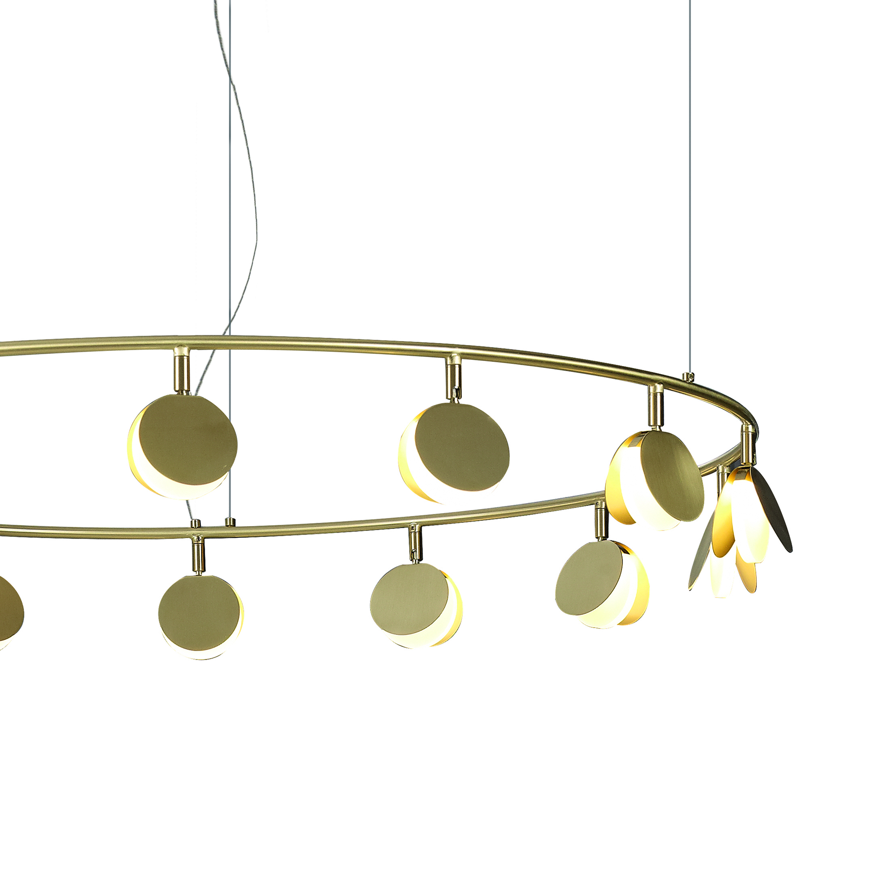 Обаятельная коллекция подвесных светильников SHELL была спроектирована российским дизайнером, Полиной Кузурман. SHELL является крайне изящной коллекцией. Она несет в себе образы вдохновения дизайнера, напоминая форму раскрывающихся ракушек или порхание стаи мотыльков. Тонкие золотые пластины распахнулись, чтобы выпустить мягкий светодиодный свет из основания формы. Множество маленьких ракушек закреплено на широком обруче. Он словно парит в воздухе, благодаря едва заметной системе подвески. Коллекция выполнена в золотой отделке и доступна в нескольких размерах. Разные системы подвесок позволяют адаптировать светильник под задачи вашего интерьера. Самая большая трехъярусная композиция коллекции представляет собой три кольца разного диаметра с разным количеством светодиодов на каждом ярусе. SHELL несомненно поддержит атмосферу комфорта и релакса в пространстве ресторана или отеля. Эта легкая и чувственная коллекция также отлично впишется в домашний интерьер гостиной или столовой.