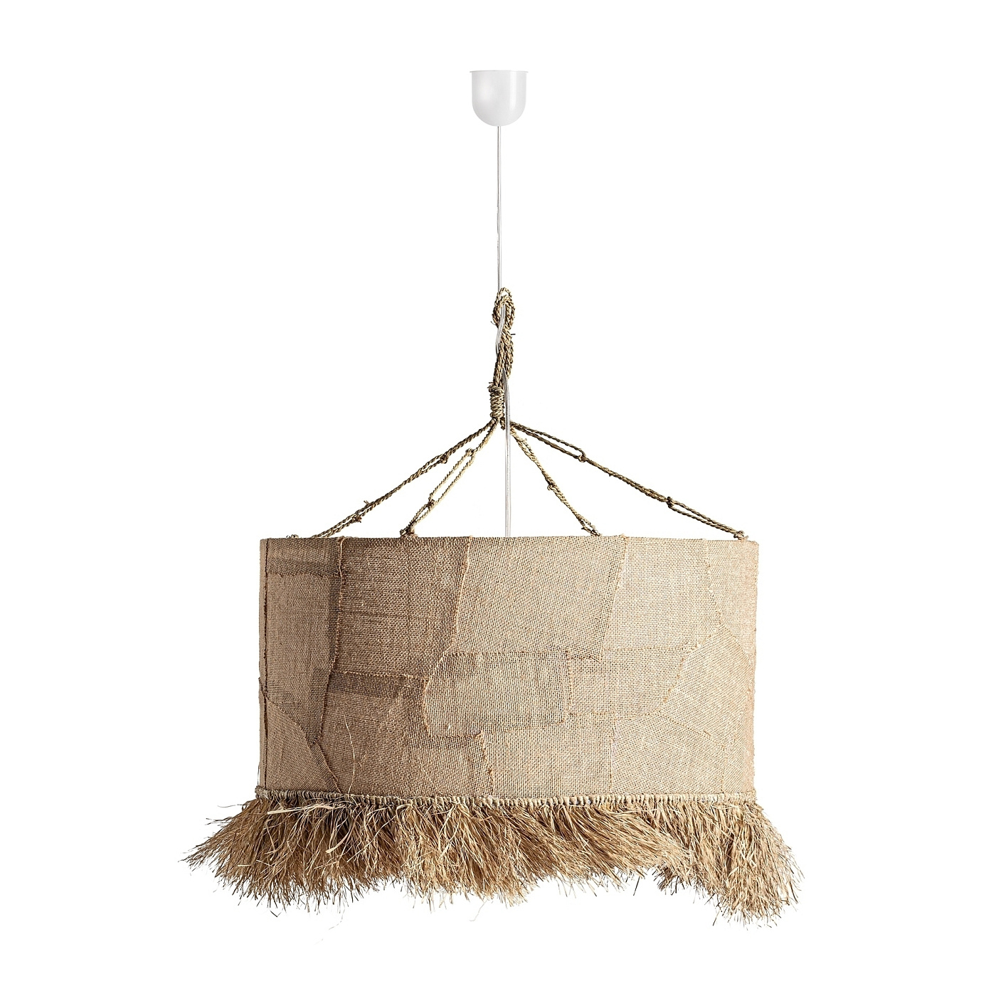 Подвесной светильник в стиле бохо, изготовлен из коричневого джута.