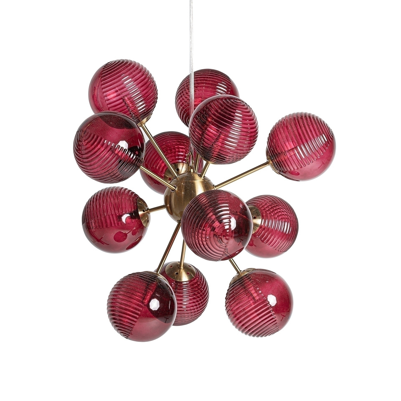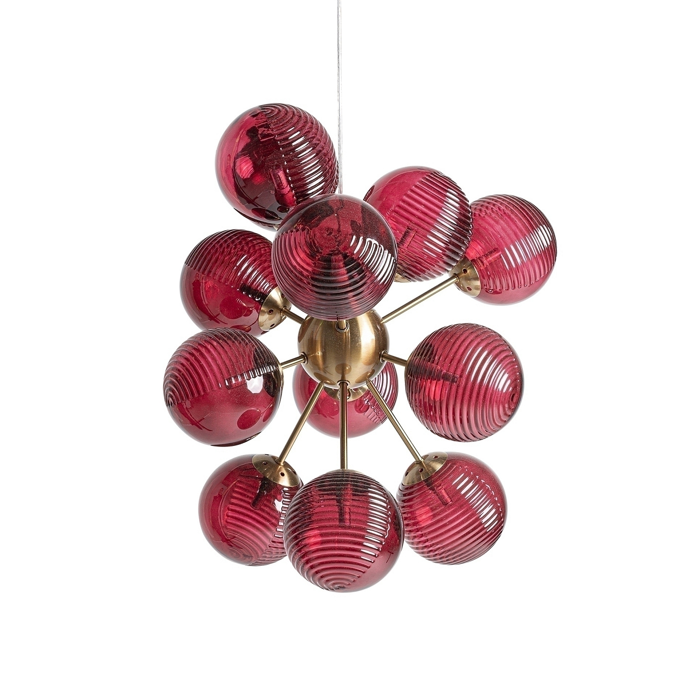 Подвесной светильник. Изготовлен из стекла красного цвета в сочетании со сталью золотого цвета. Съемное изделие.