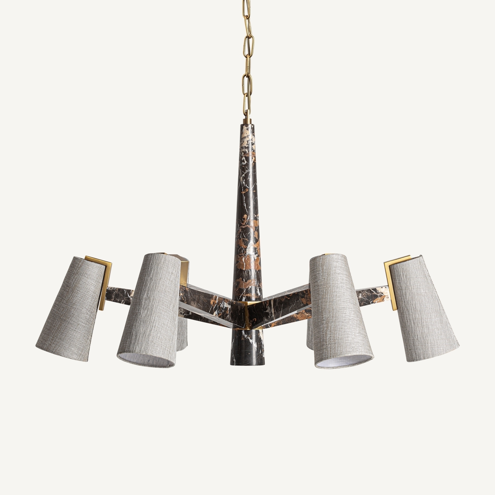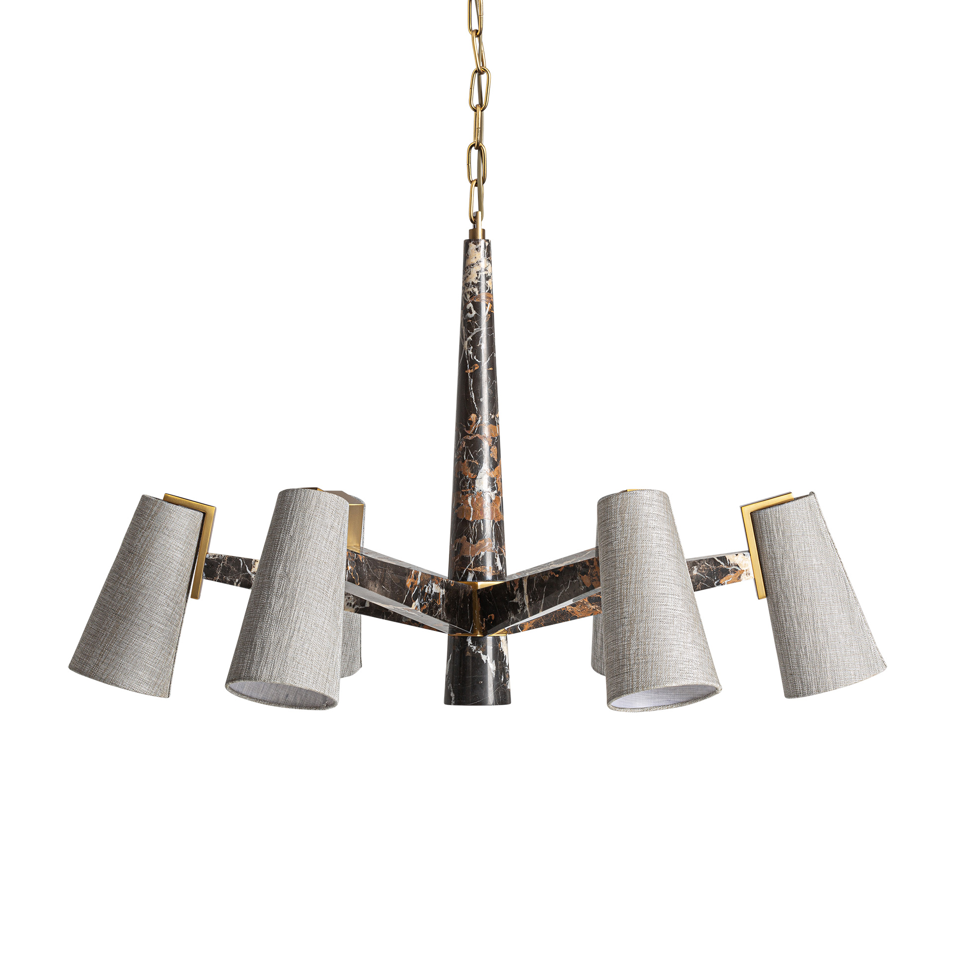 Подвесной светильник Wale в стиле ар-деко, изготовленный из черного мрамора в сочетании с металлом золотистого цвета и полиэстером кремового оттенка. Изделие разборное. Ширина: 97 см, Глубина: 97 см, Высота: 58 см