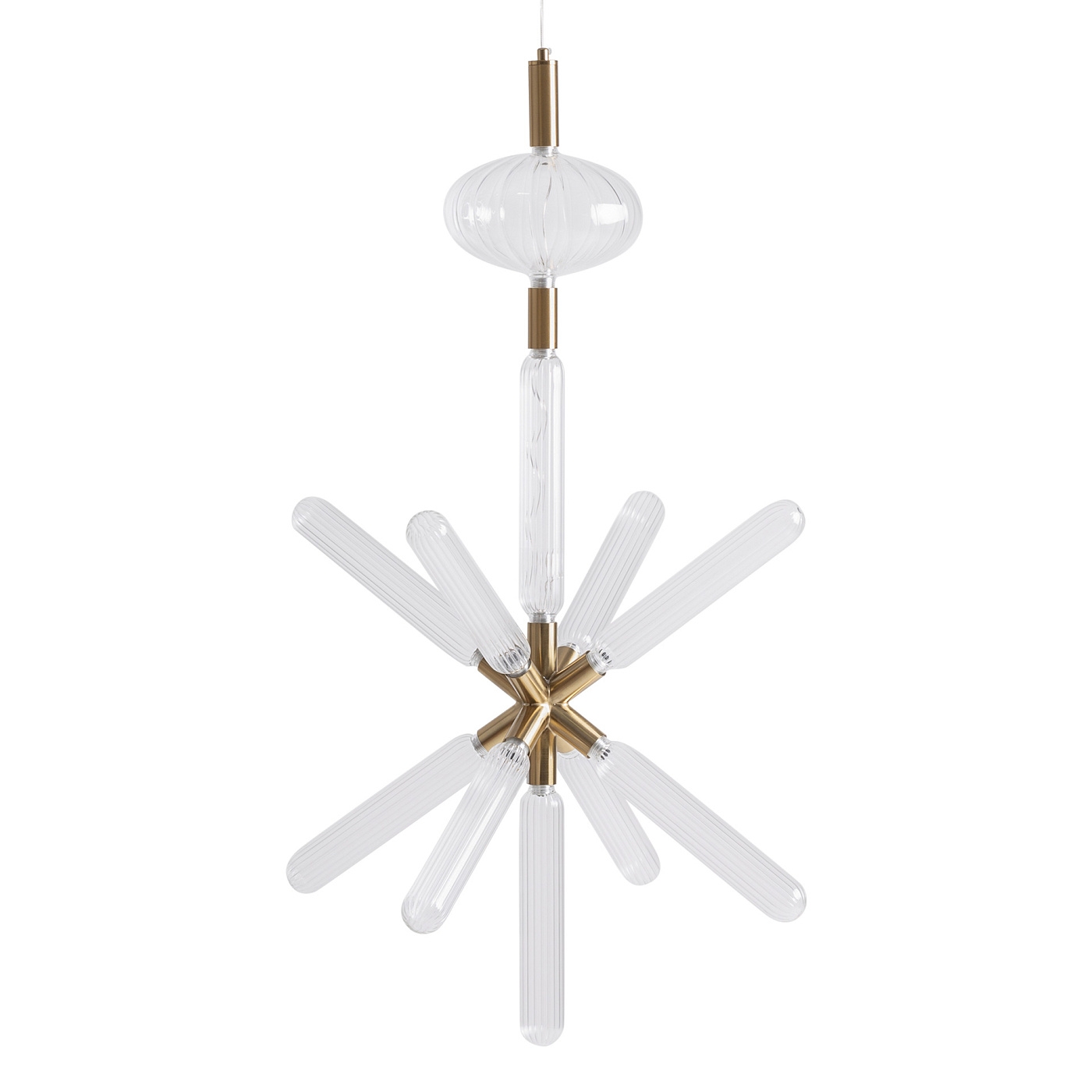 Подвесной светильник из прозрачного стекла в сочетании со сталью бронзового цвета. Ширина: 56 см, Глубина: 56 см, Высота: 92 см