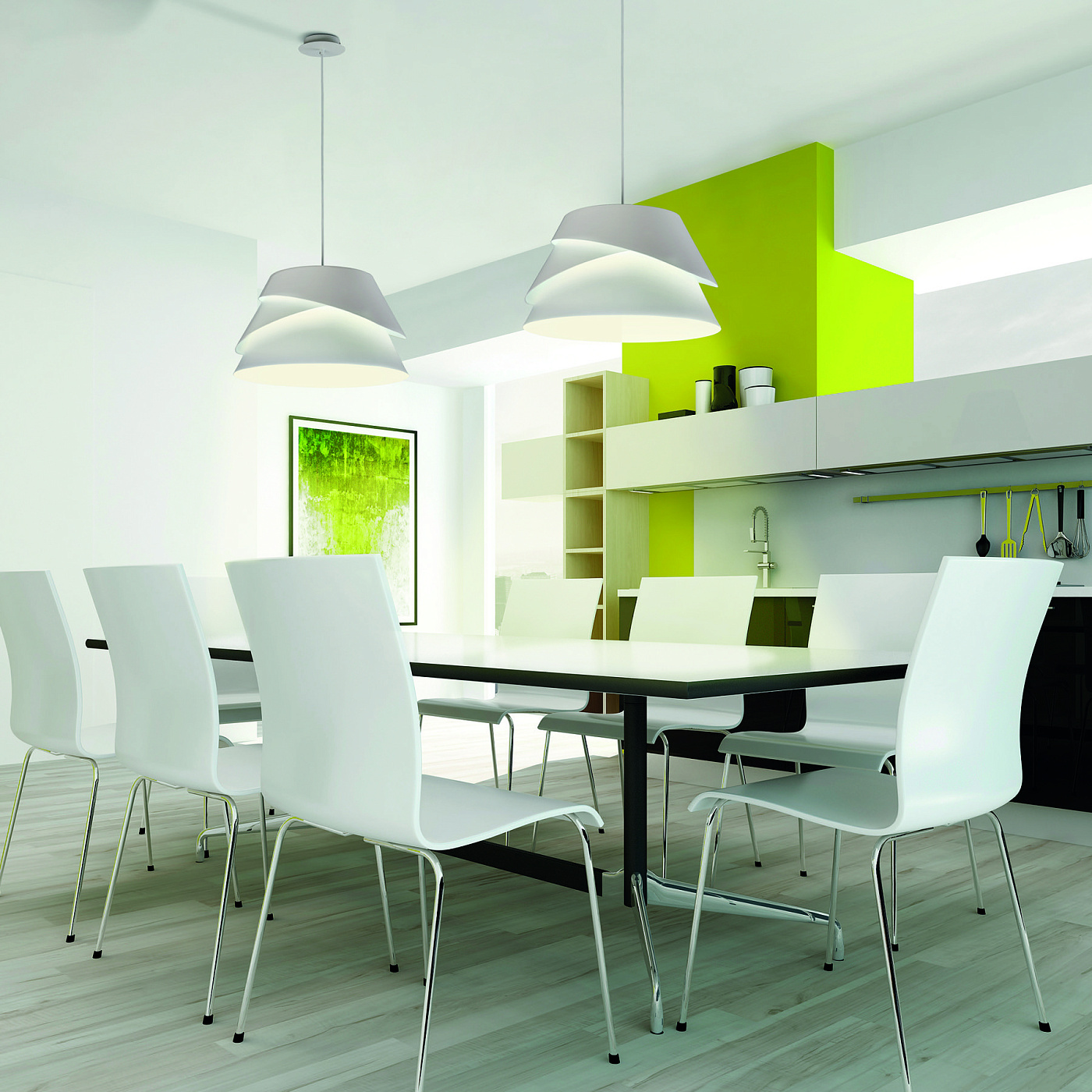 Светильник Alborаn, выполненный в белом цвете, воплощает в себе случайное движение морской волны и отражений, создаваемых проекцией, которая пропускает свет между металлических экранов разного размера.