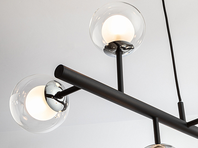 Подвесной светильник из металла с матовым чёрным покрытием с хромированными элементами. Двойные сферические плафоны: внутри из опалового стекла и снаружи из прозрачного стекла. Включает 9 светодиодов G9, 6 Вт.