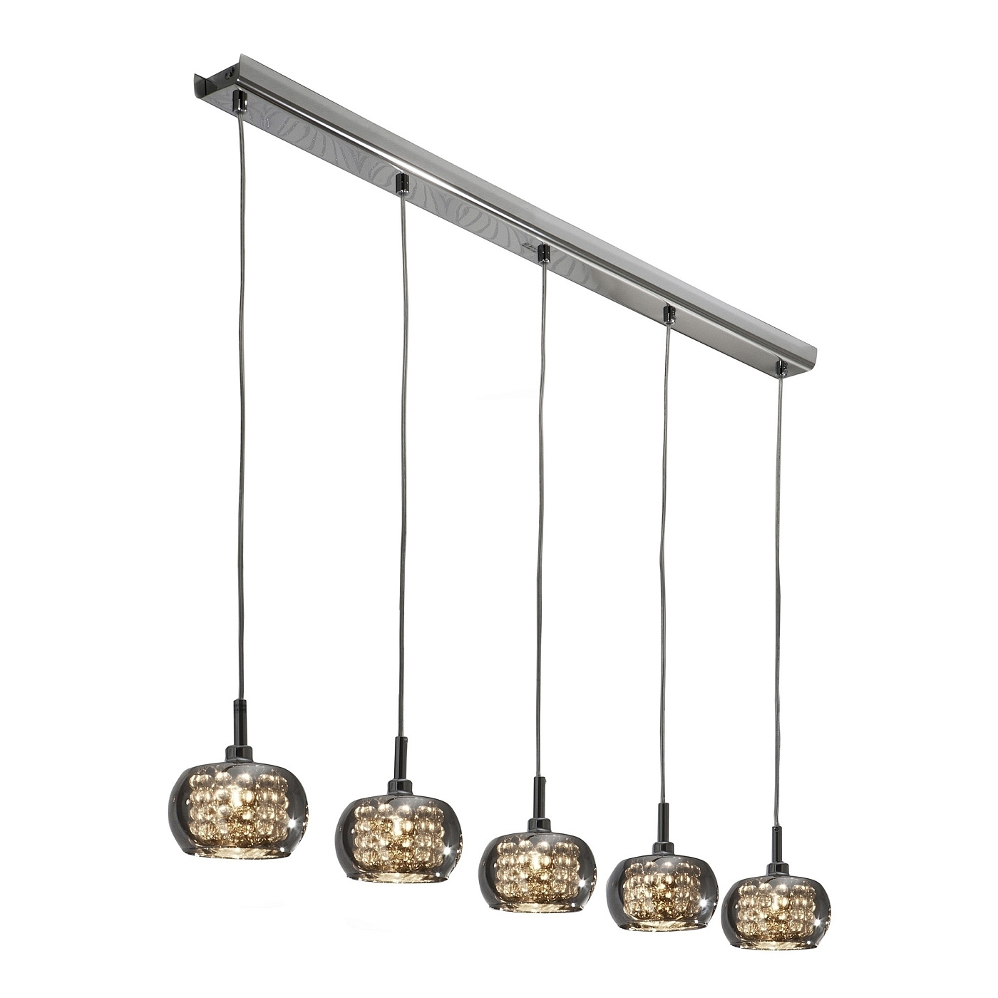 Подвесной светильник с 5 лампами из стали с блестящим покрытием. Плафоны из зеркального стекла, внутри нити бусин из стекла. Диммируемый. В комплекте с пультом ДУ. Этот продукт включает в себя диммер приемника и радиочастотный пульт дистанционного управления. · Включает 5 светодиодов G9 мощностью 4,5 Вт.