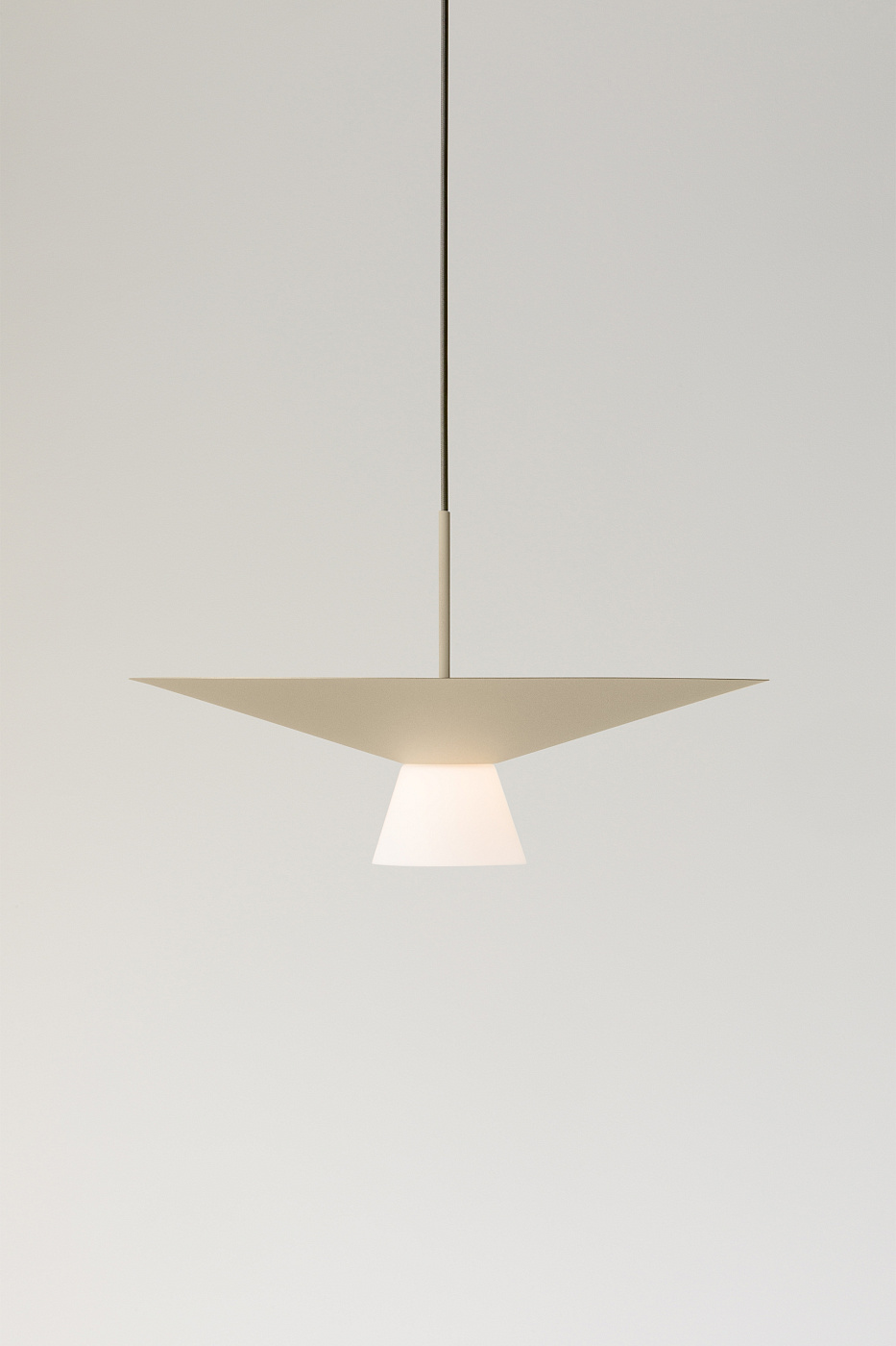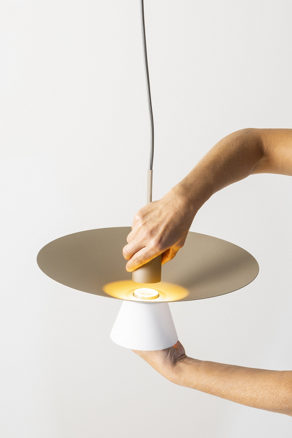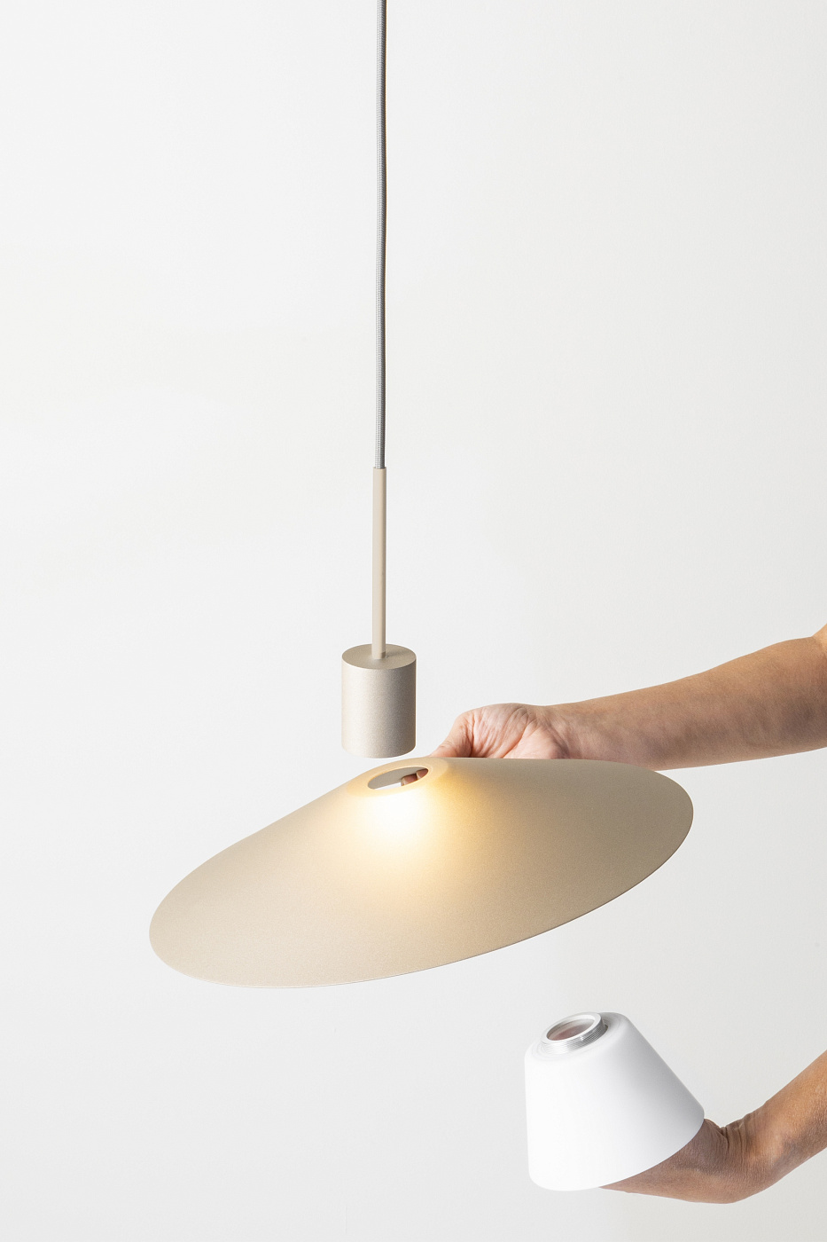 Подвесной светильник с металлическим корпусом, текстильным кабелем, опциональным стеклянным абажуром, акриловым (ПММА) рассеивателем линз и встроенным светодиодом. Стеклянный абажур можно исключить для другого стиля дизайна. Регулируемая высота с индивидуальным навесом, подходит для создания различных композиций.