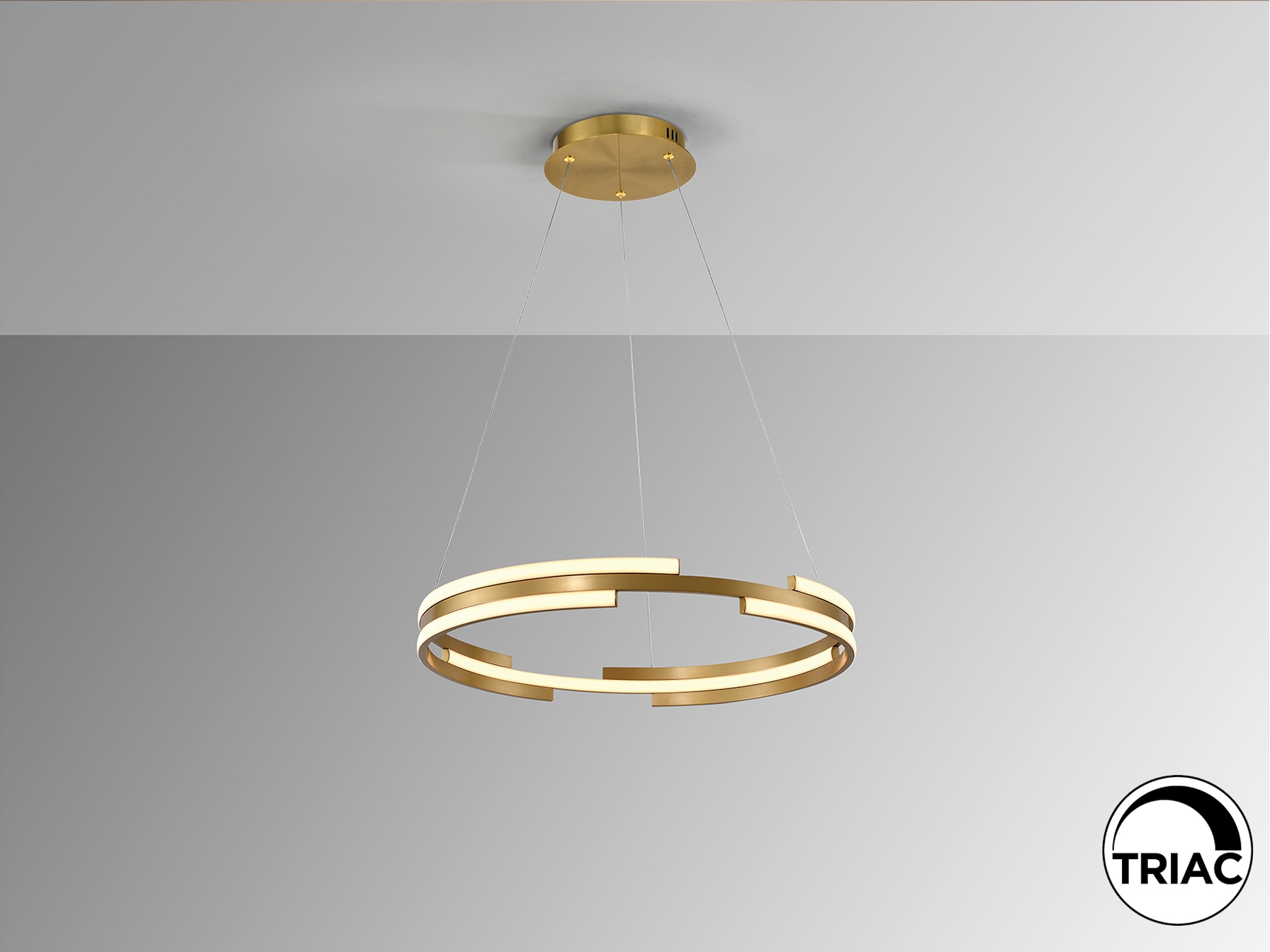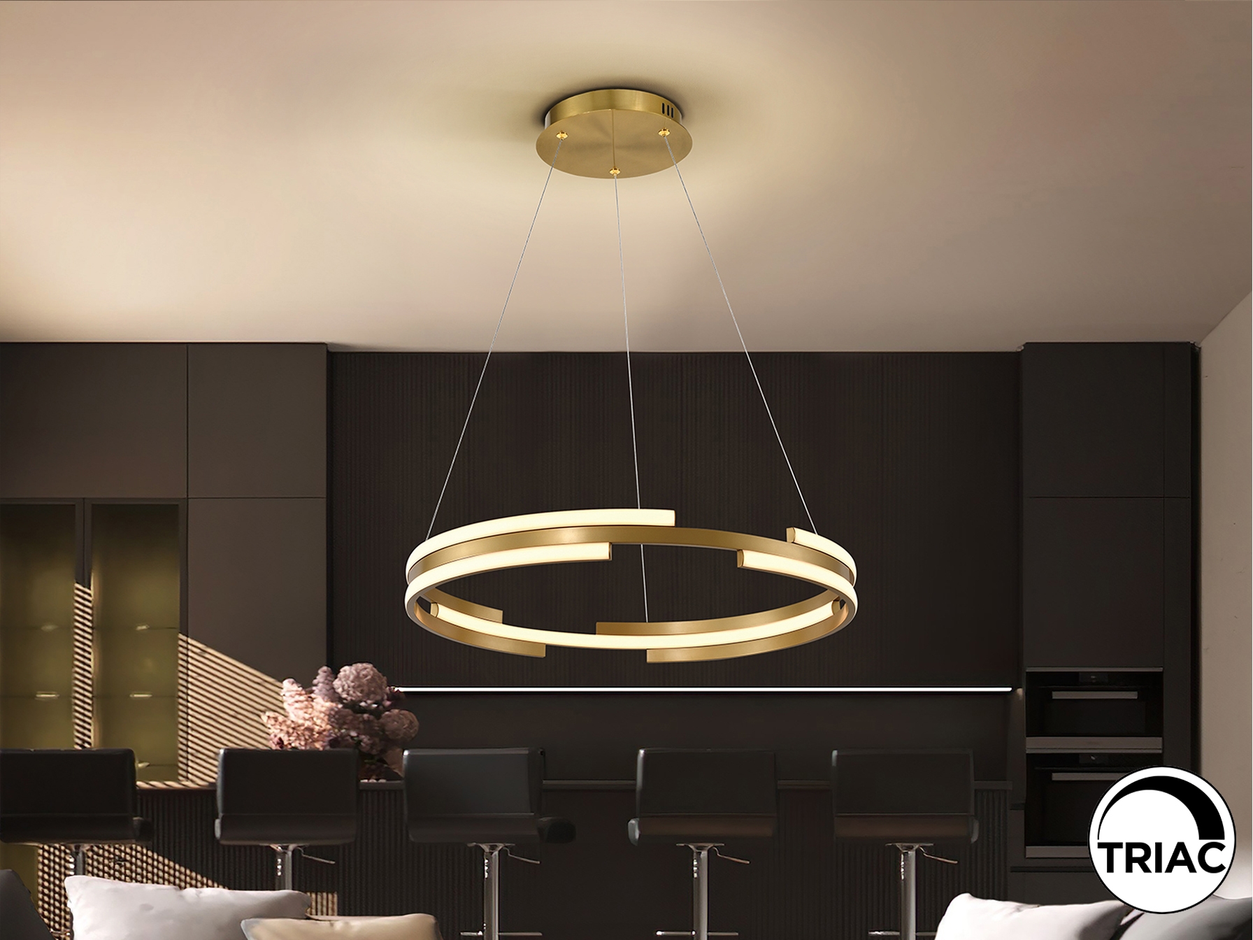 Светильник из металла и алюминия с золотой отделкой. Опаловый силиконовый рассеиватель. Светодиоды мощностью 52 Вт. 3800 лм. 3000К. ДИММИРУЕМАЯ. В этом продукте используется светодиодный драйвер симисторного типа и регулировка яркости 0–10 В. Его можно затемнить с помощью светодиодного настенного диммера с этими функциями. · Эта лампа поставляется с ГРАВИТАЦИОННЫМИ ПЕРЕКЛЮЧАТЕЛЯМИ для улучшения крепления к потолку.