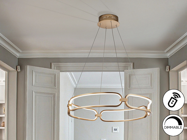 Светодиодная лампа из матового алюминия с покрытием из розового золота. Регулируется по высоте. Опаловые силиконовые диффузоры. Светодиод 54 Вт, 4860 лм, 3000 К. С возможностью затемнения. Включает пульт дистанционного управления. Этот продукт включает драйверы светодиодов с диммером 0-10 В или ШИМ, приемник и радиочастотный пульт дистанционного управления. Для использования с настенным регулятором используйте только диммеры этих двух типов регулирования. Диммер другого типа может повредить драйвер светодиода.