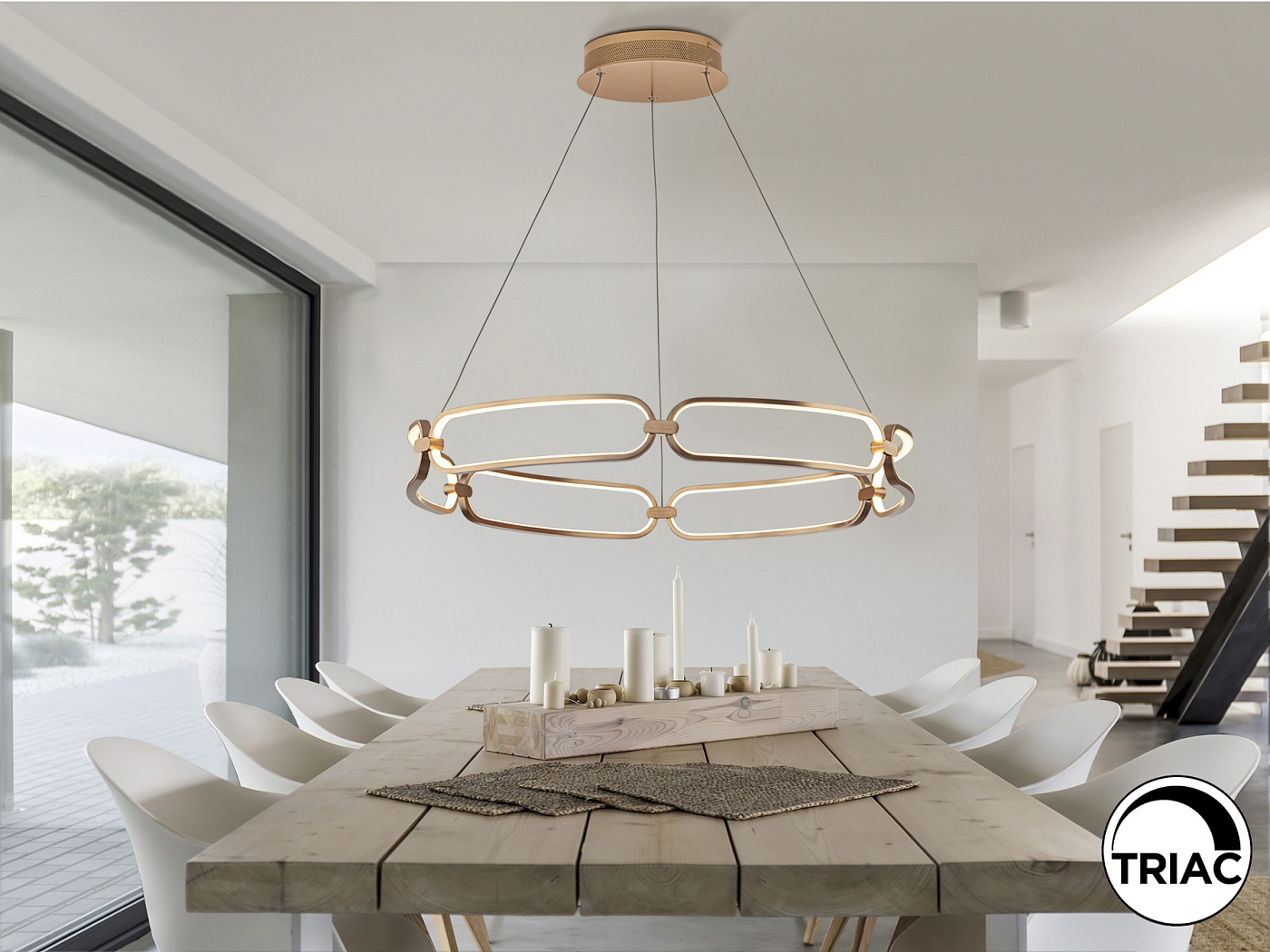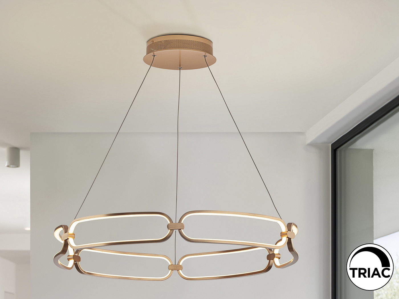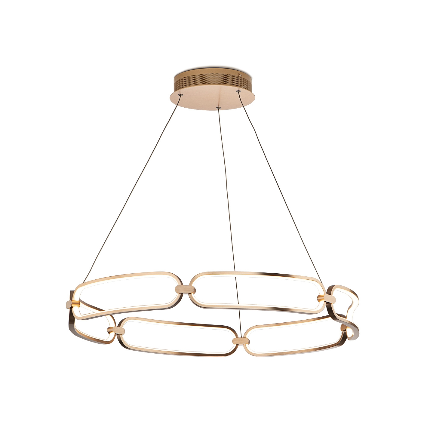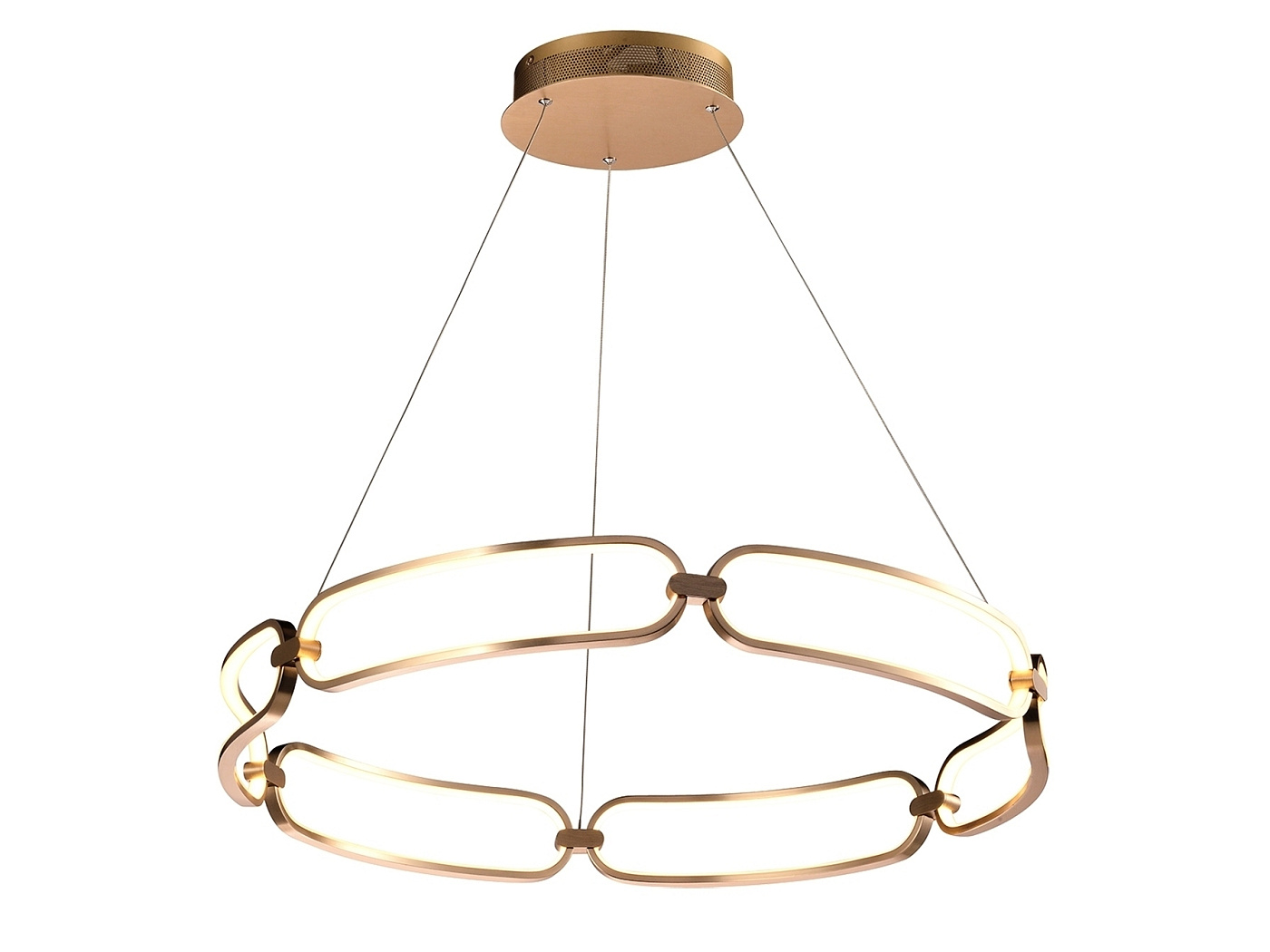 Подвесной светильник LED маленького размера, из алюминия с матовым полированным золотистым покрытием. Силиконовые рассеиватели опалового цвета. С регулируемой высотой, 65W LED, 5850 Lm, 3000 K.