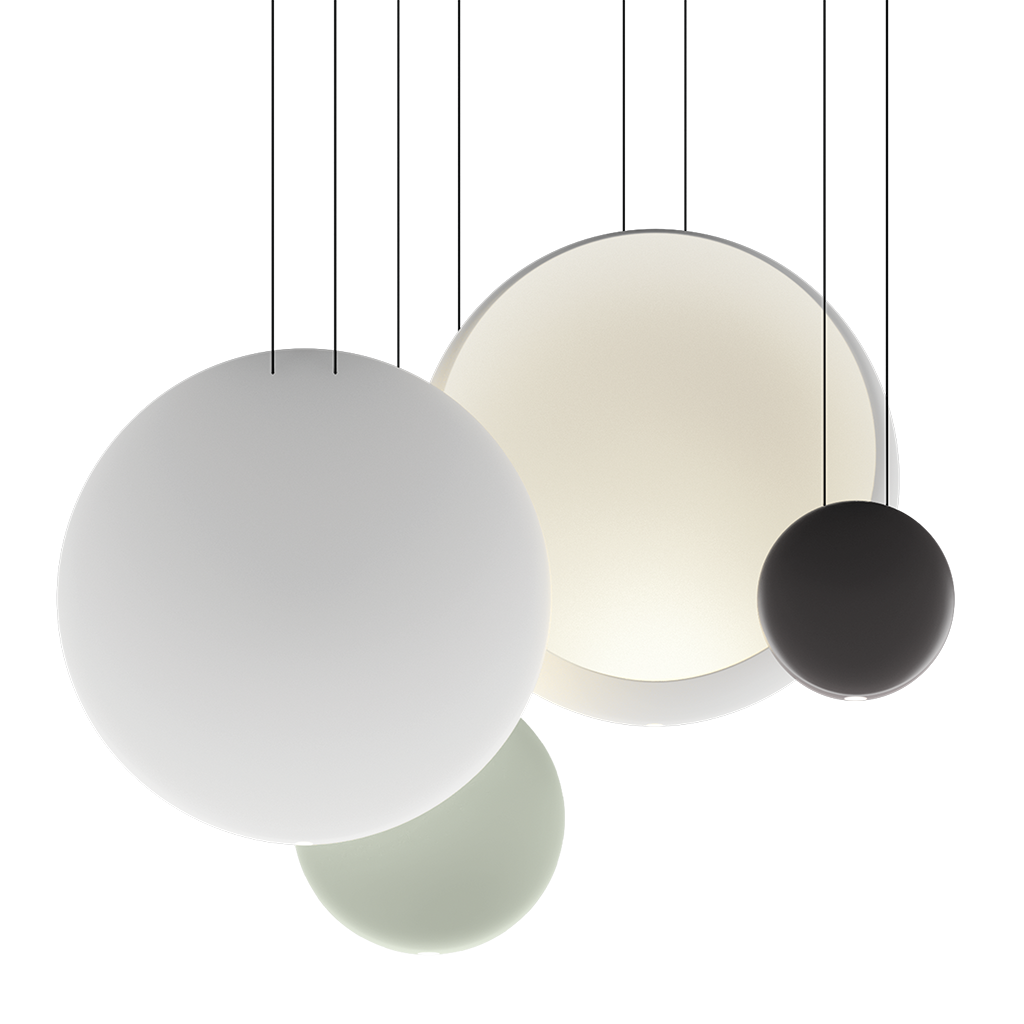 Дизайнерские подвесные светильники Cosmos создают интересный визуальный эффект: благодаря приятной матовой поверхности, создается впечатление, что они обладают сферической формой, однако в фронтоне их ширина составляет всего 4-7 см. Плоские круглые плафоны изготовлены из поликарбоната, сквозь который мягко излучается свет. Снизу каждого светильника установлен светодиод, который собирает концентрированный свет и позволяет выделить ту или иную область пространства.