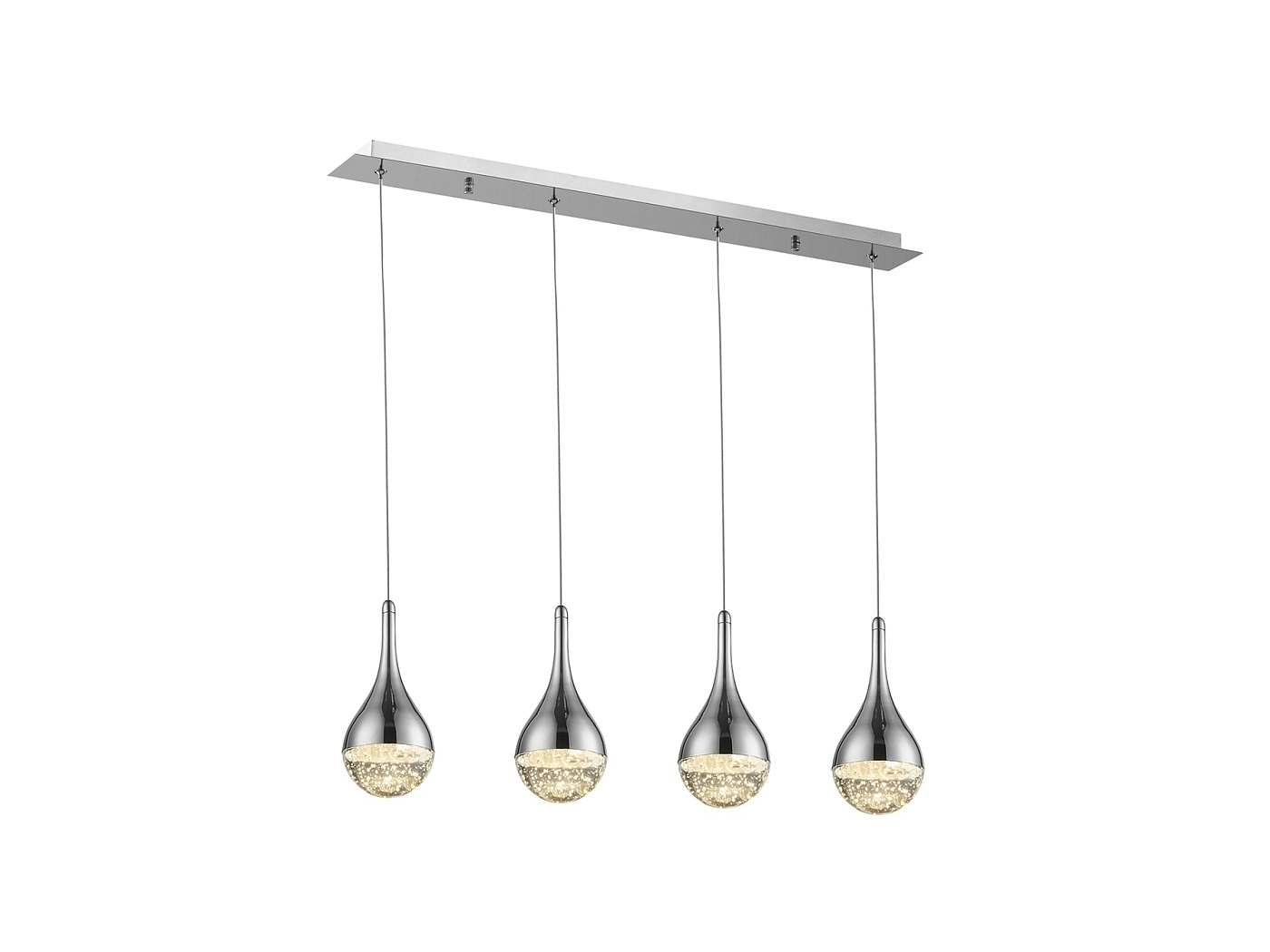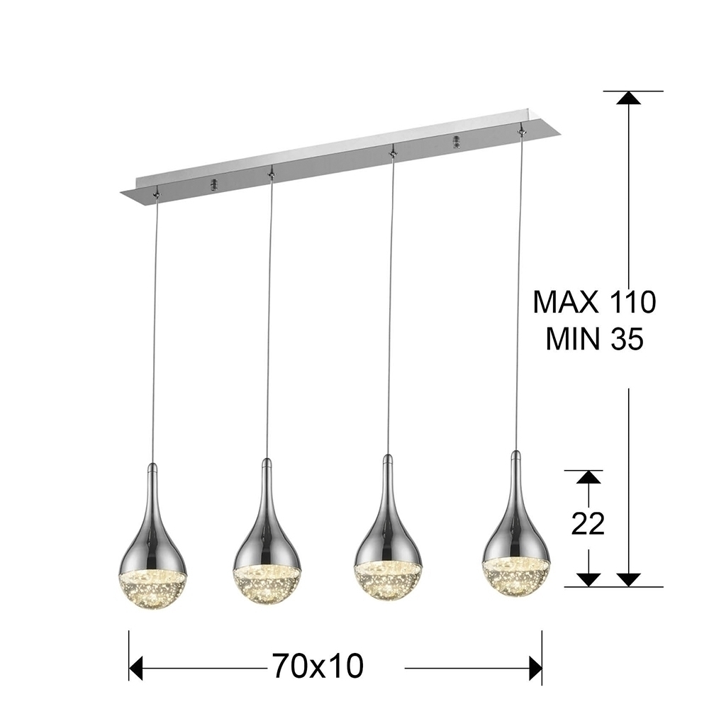 Подвесной светильник LED с 4 лампами из металла с покрытием "хром". Плафоны в форме капли из массивного стекла с декоративными пузырьками внутри. С регулируемой высотой. 4х5W LED, 1600 Lm, 3000 K.
