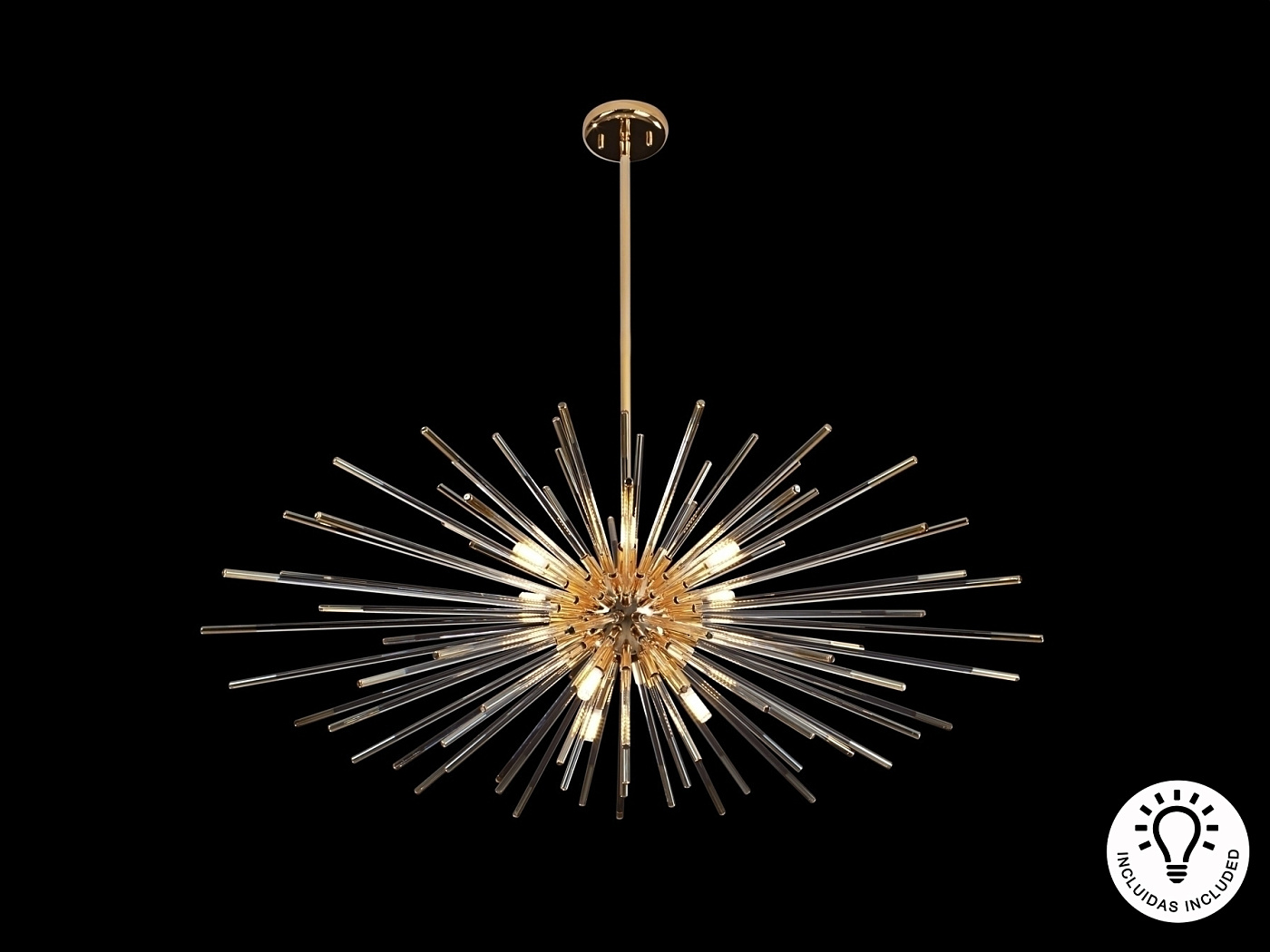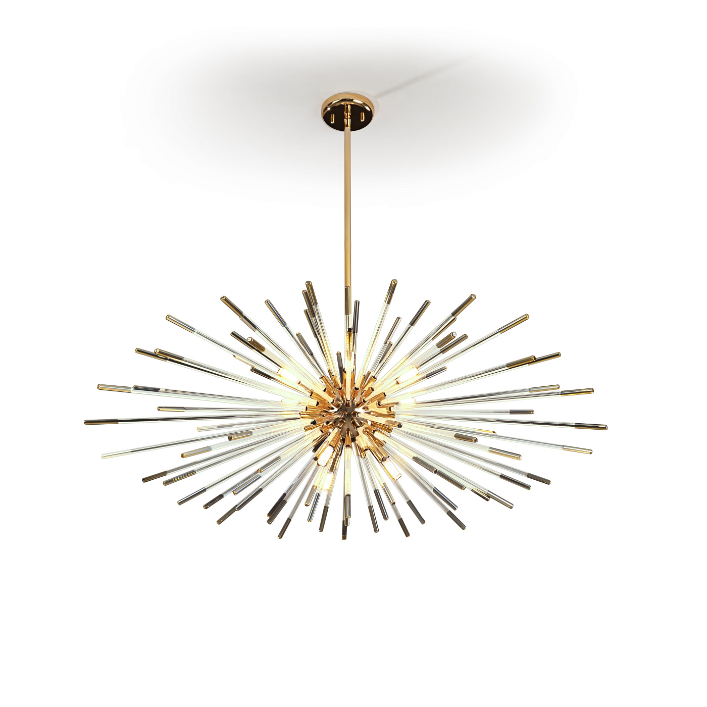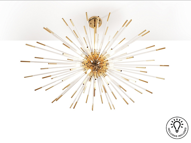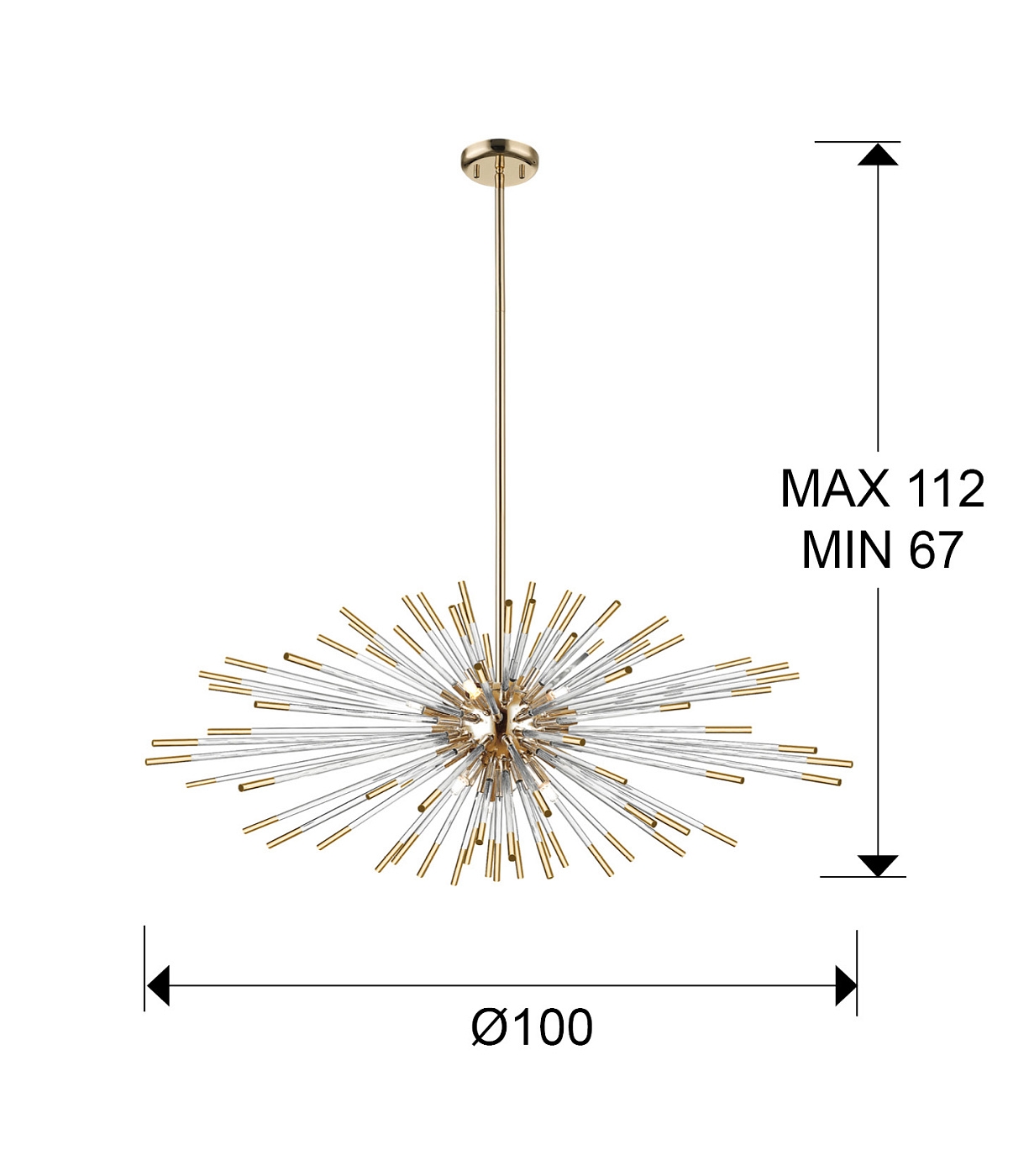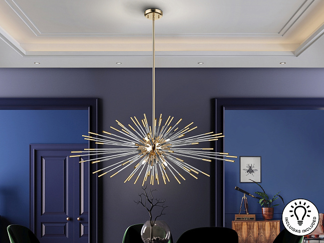 Подвесной шарообразный светильник из золотого металла. Стержни из прозрачного стекла с покрытием "янтарь" на концах, с регулируемой высотой. Включает 9 светодиодов G9, 6 Вт.