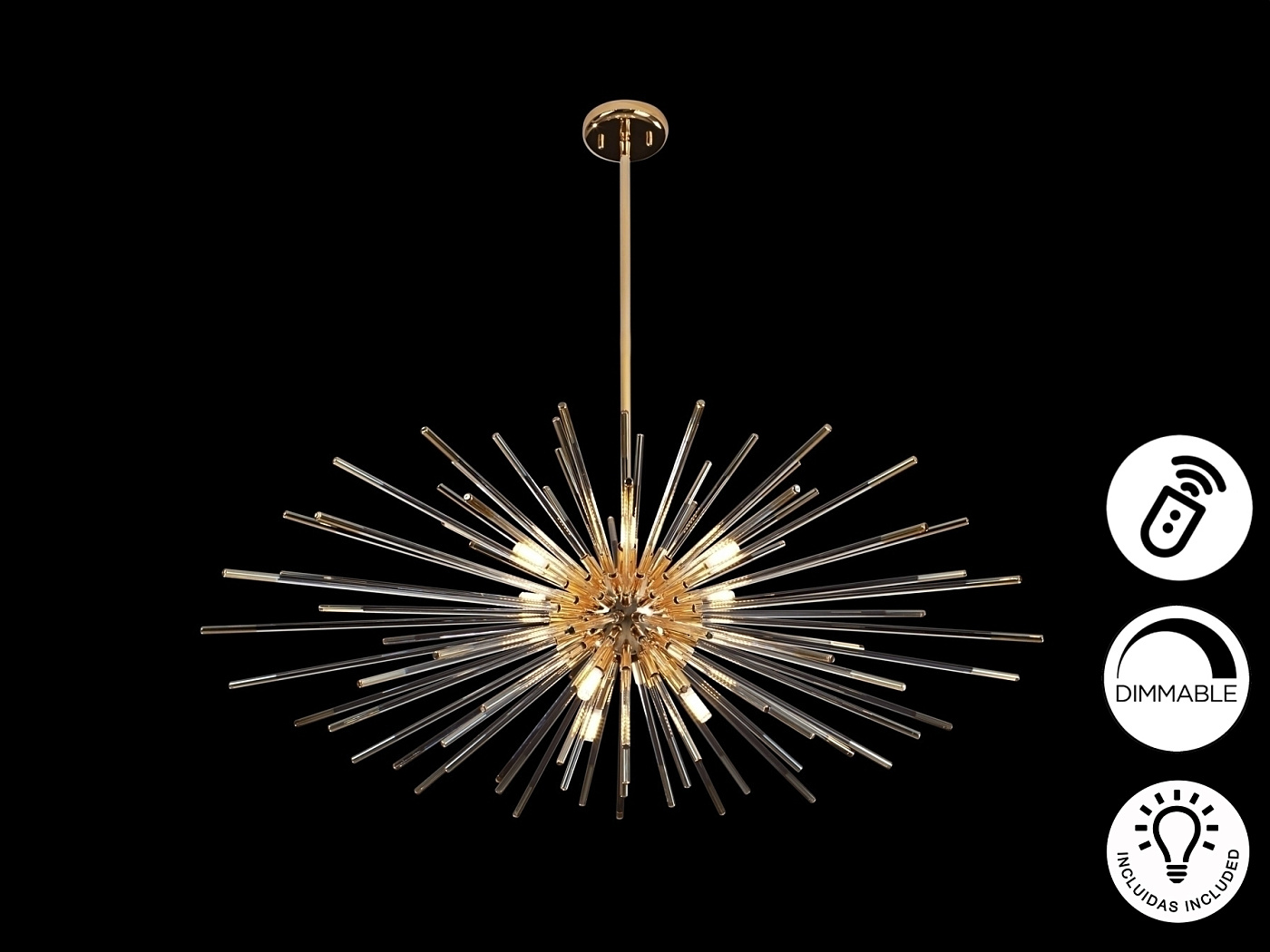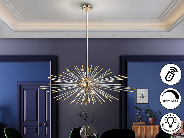 Подвесной шарообразный светильник из золотого металла. Стержни из прозрачного стекла с покрытием "янтарь" на концах, с регулируемой высотой. Диммируемый. Этот продукт включает в себя диммер приемника и радиочастотный пульт дистанционного управления. · Включает 9 светодиодов G9 мощностью 4,5 Вт.
