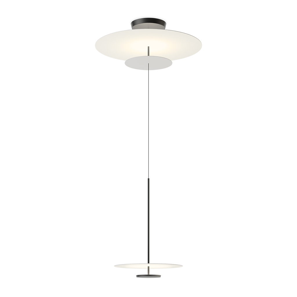 Плоские лампы — творение дизайнера Ичиро Ивасаки. Диски света спускаются с потолка, образуя подвесной светильник, где плоскости отраженного света сливаются с архитектурой. Все модели коллекции Flat оснащены светодиодным освещением и доступны в различных нейтральных тонах. Отрегулируйте высоту при установке.