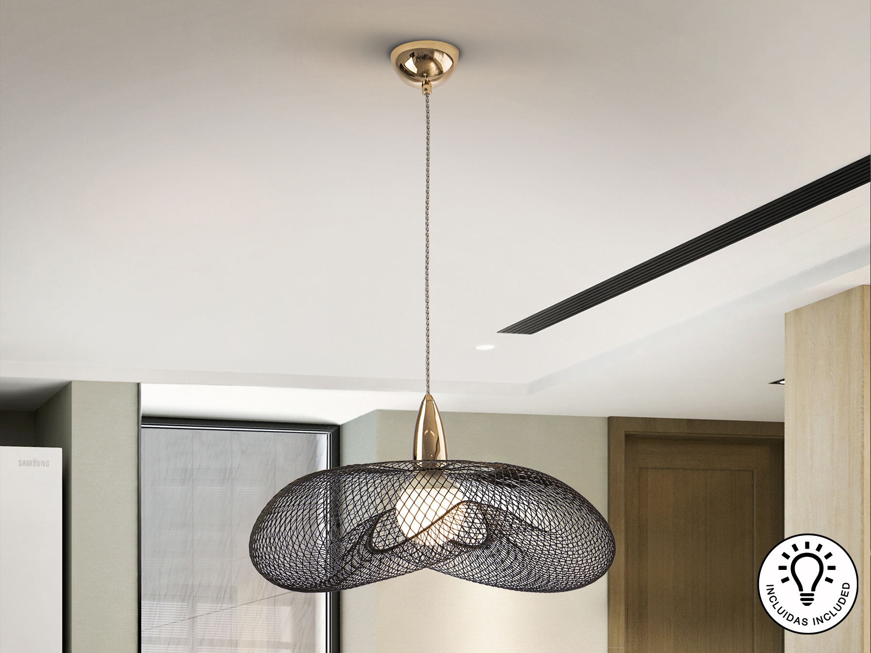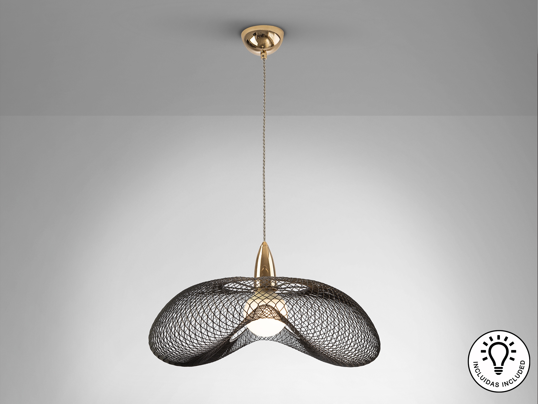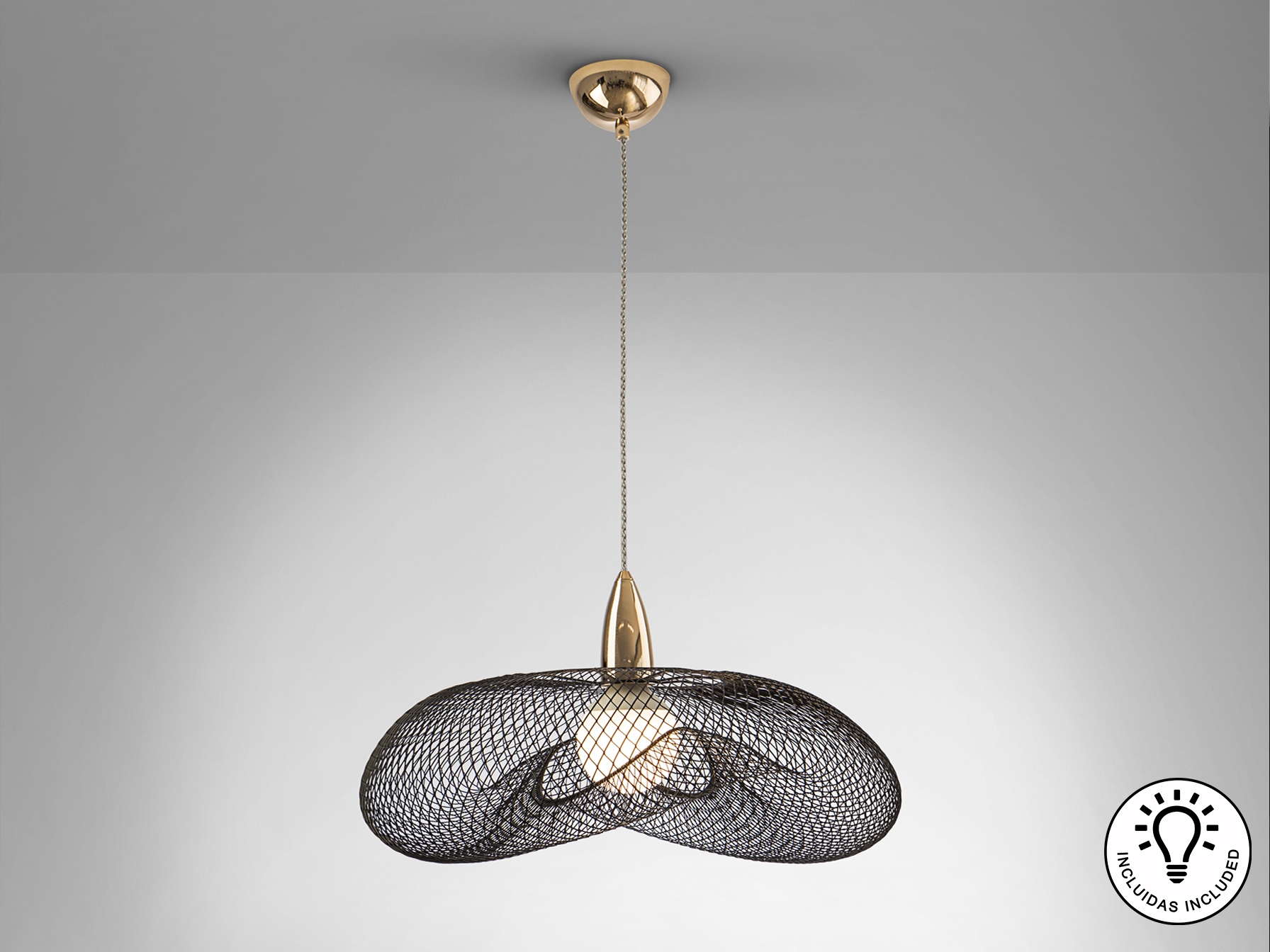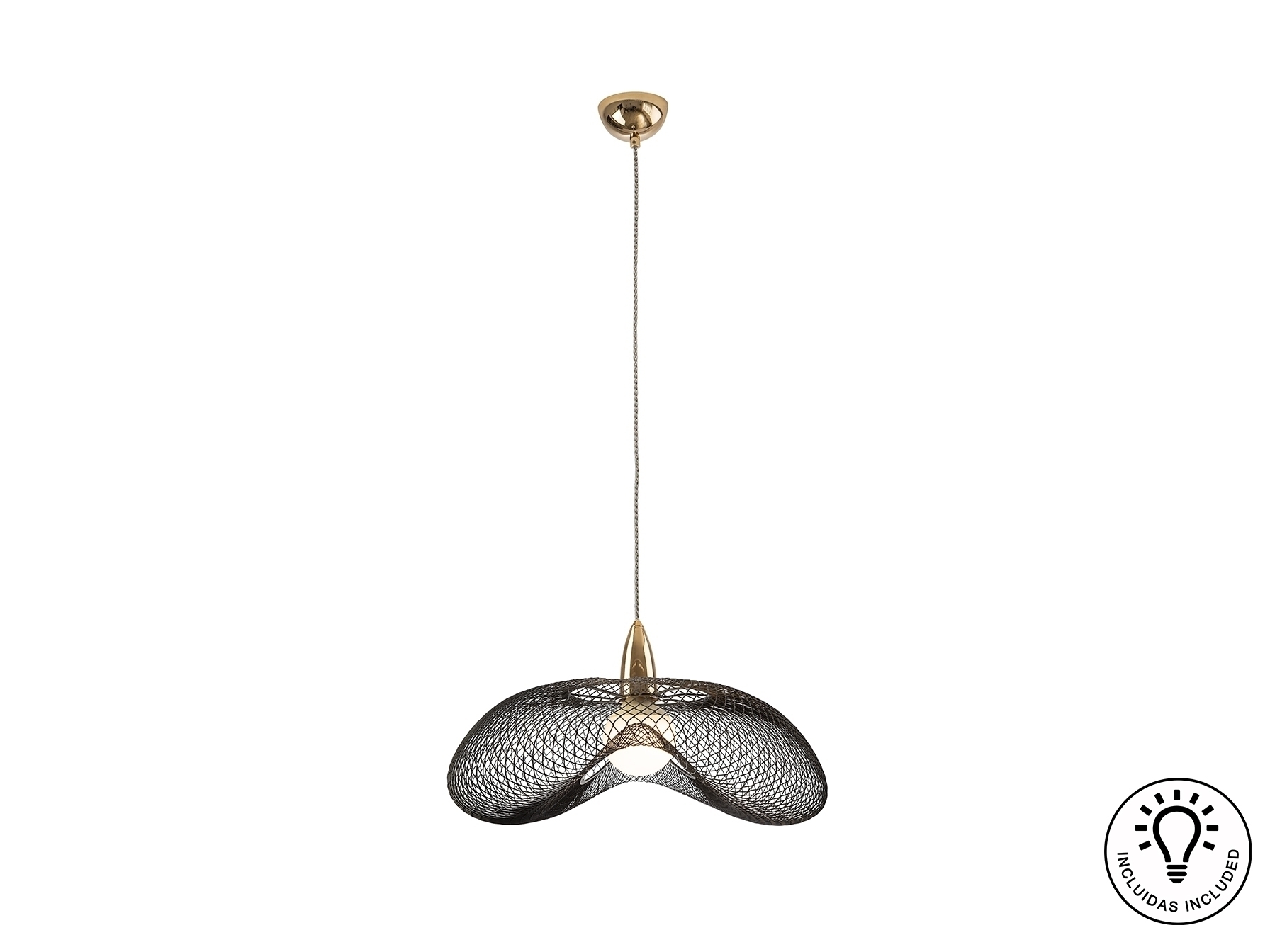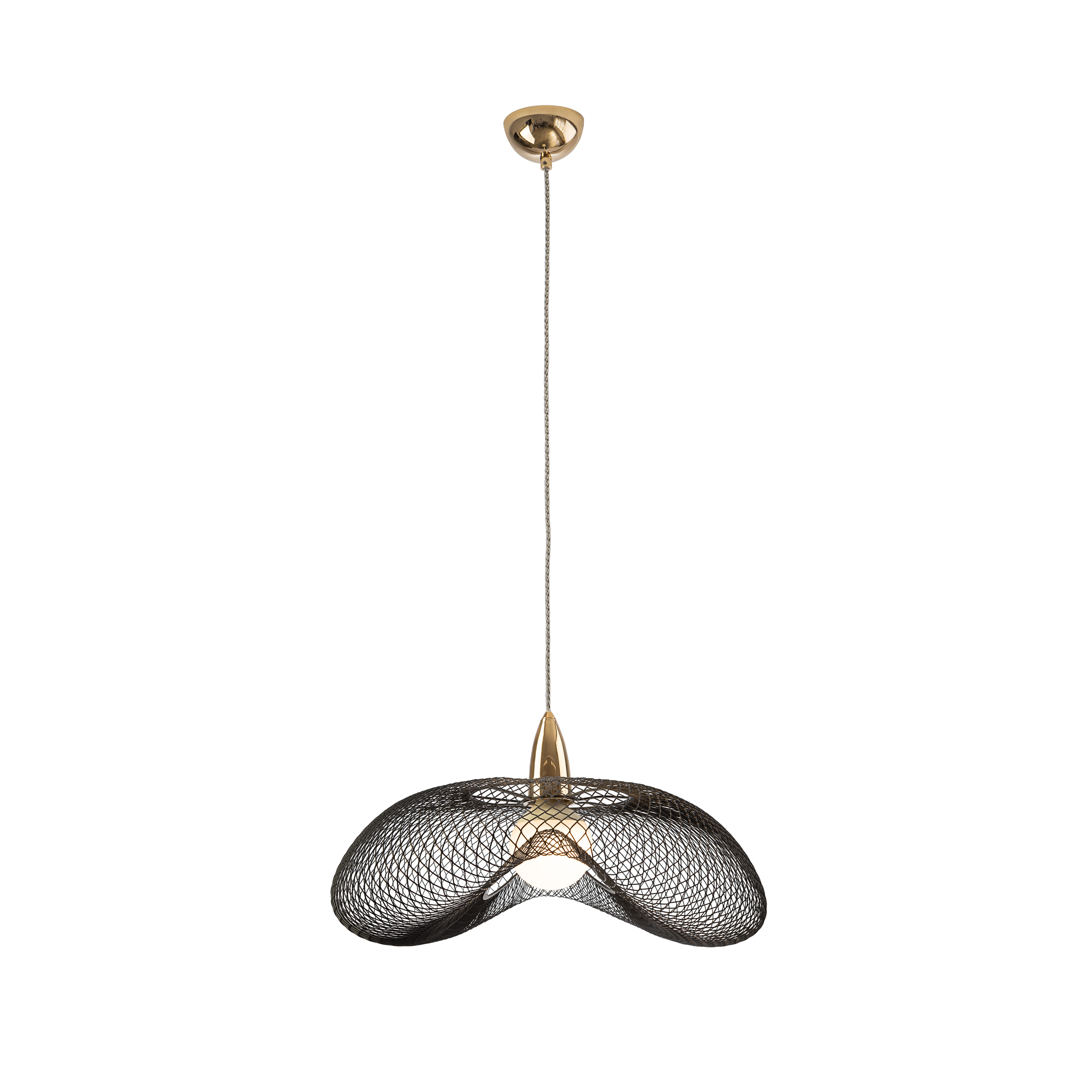 Лампа на 1 лампу из металла с блестящей золотой отделкой и абажур из черной металлической сетки. Прозрачный витой кабель. Включает 1 светодиод E27 15 Вт.