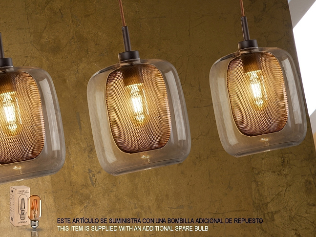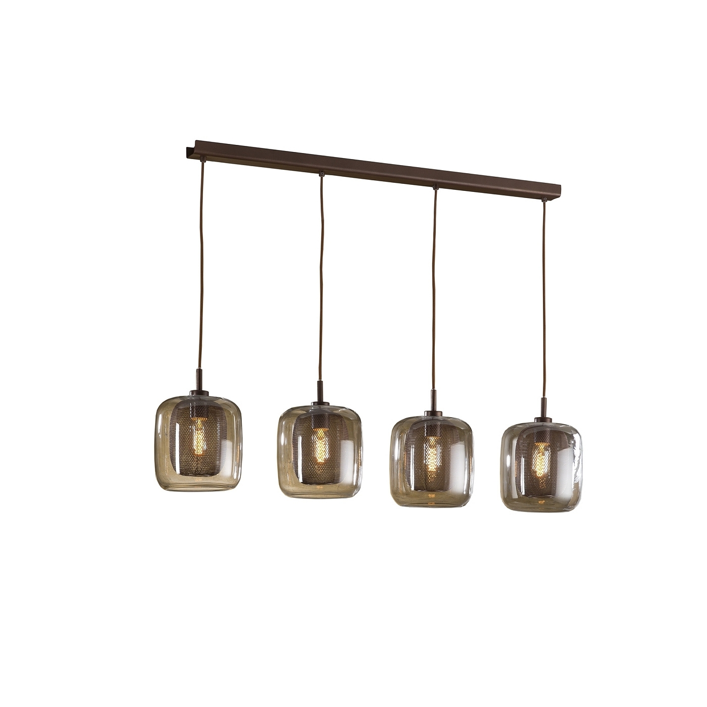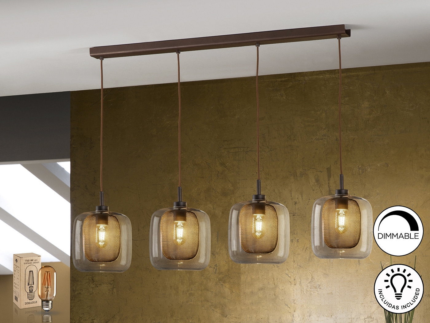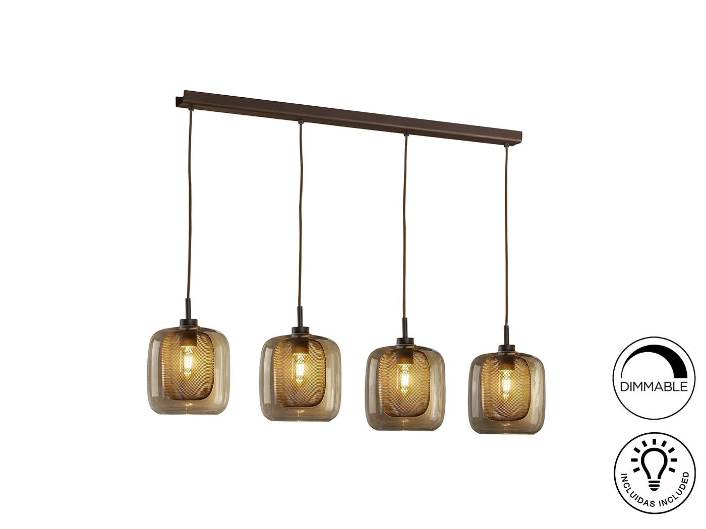 Подвесной светильник из металла, покрытого лаком шоколадного цвета. Двойной плафон: внешний из стекла и внутренний из металлической сетки. Включает 4 светодиода E27 мощностью 8 Вт. Диммируемый.