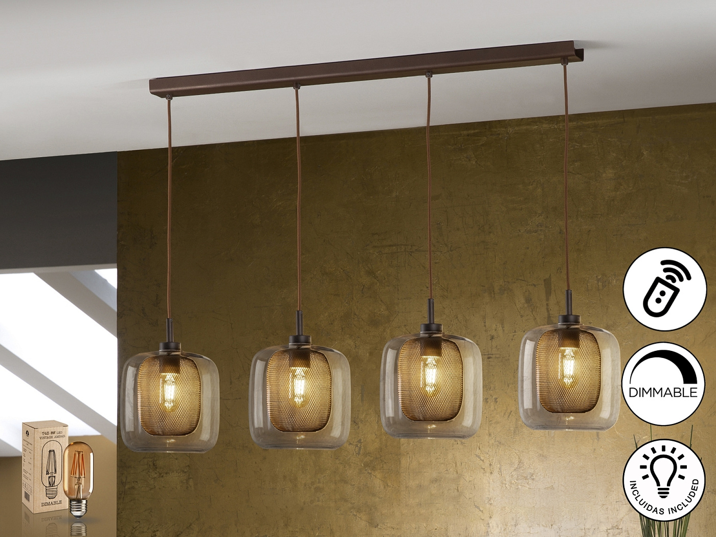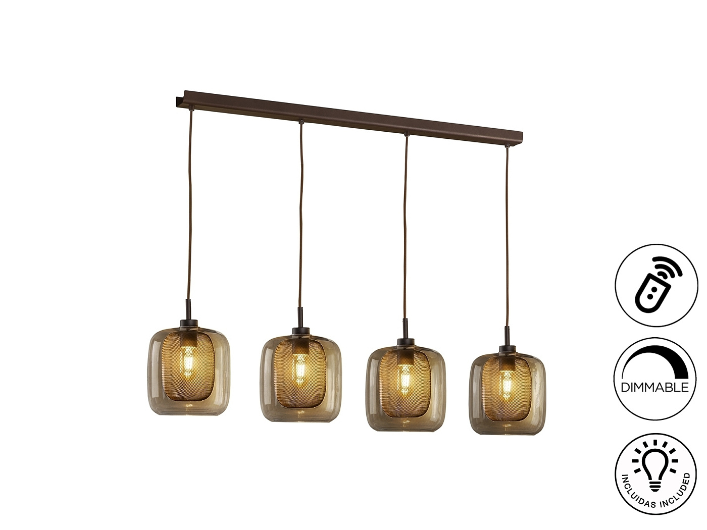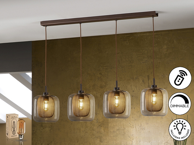 Подвесной светильник с 4 лампами из металла, покрытого лаком шоколадного цвета. Двойной плафон: внутренний из металлической сетки и внешний из стекла. Диммируемый. В комплекте с пультом ДУ. Этот продукт включает в себя диммер приемника и радиочастотный пульт дистанционного управления. · Включает 4 светодиода E27 мощностью 8 Вт.