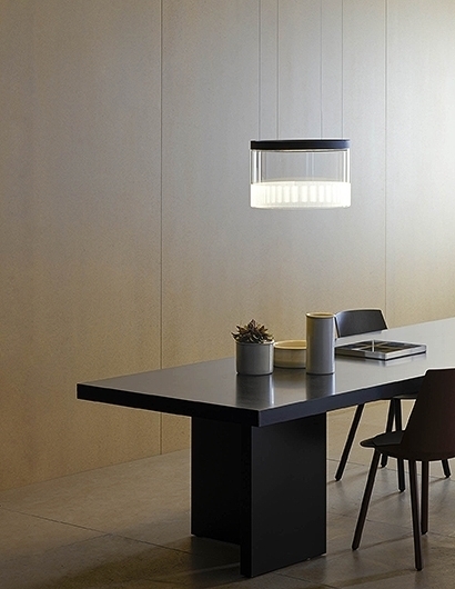 Vibia представляет подвесной светильник из цельного вертикального куска стекла. Мощный и остроконечный светодиодный источник благодаря своей конструкции превращается в равномерный фоновый световой эффект.
