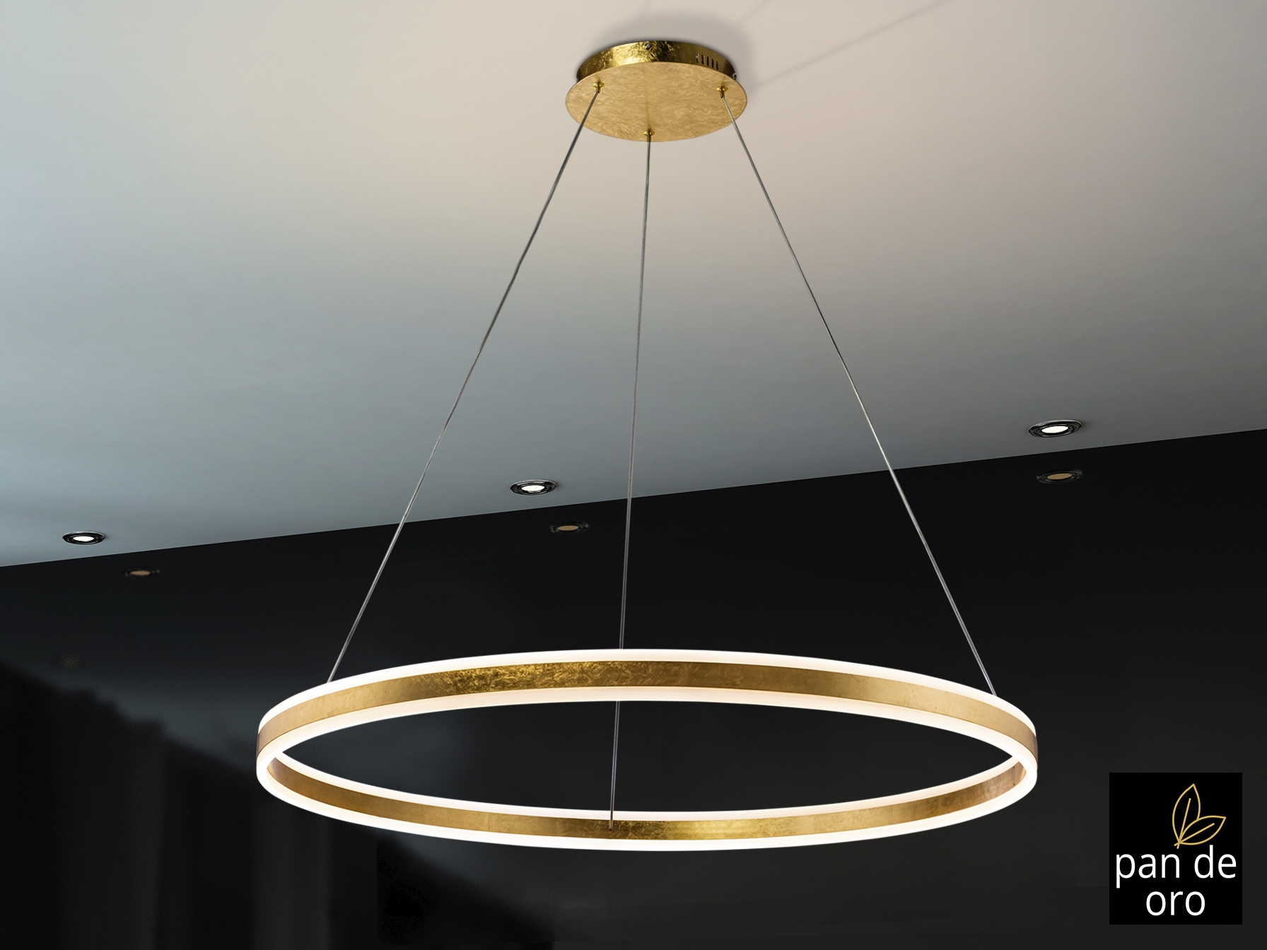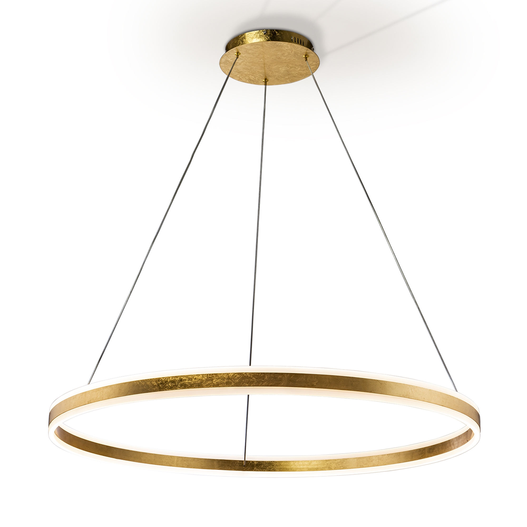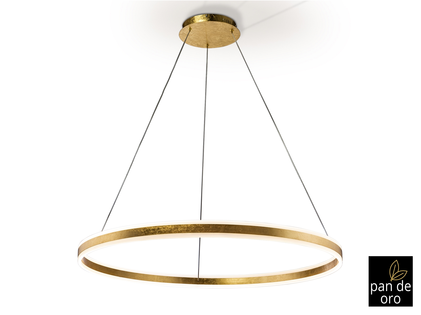 Подвесной светильник из металла и алюминия, покрытие из ЗОЛОТОЙ фольги. Обруч с акриловым рассеивателем опалового цвета. С регулируемой высотой. 110W LED, 6600 Lm, 3000 K.