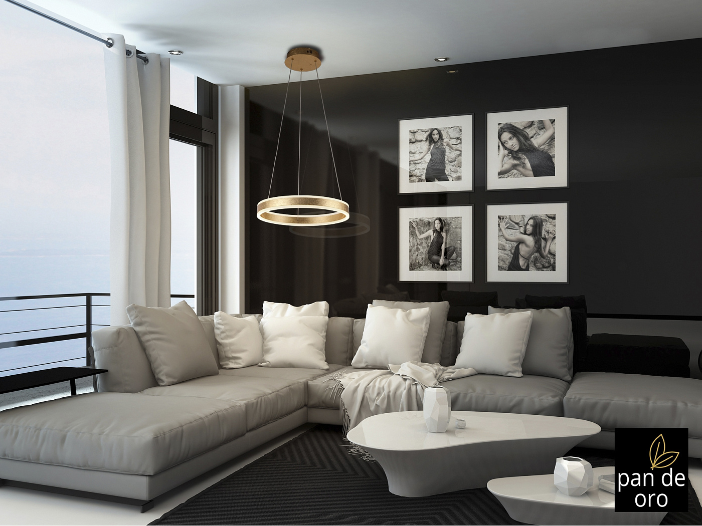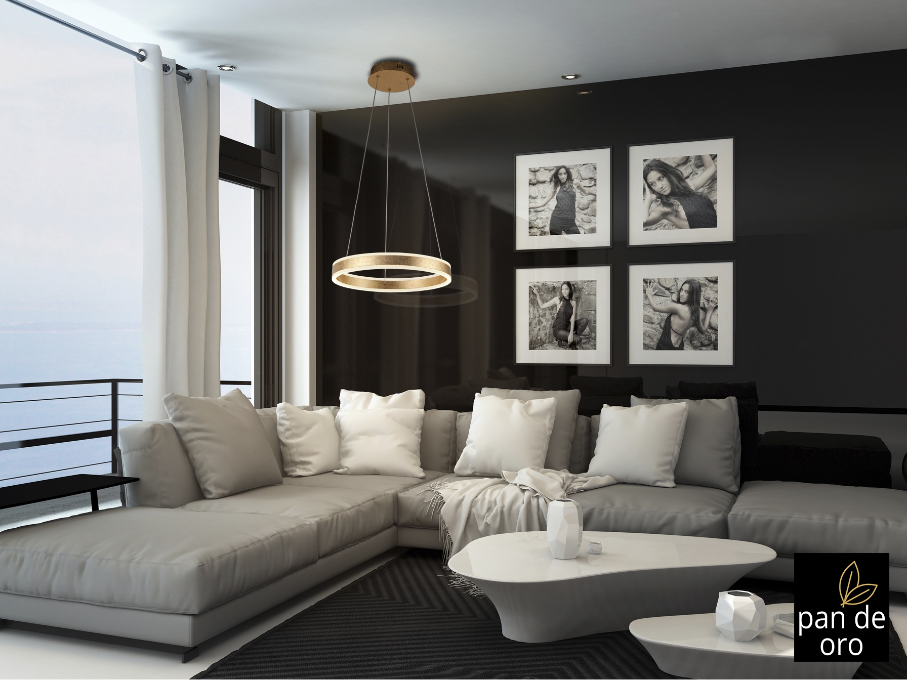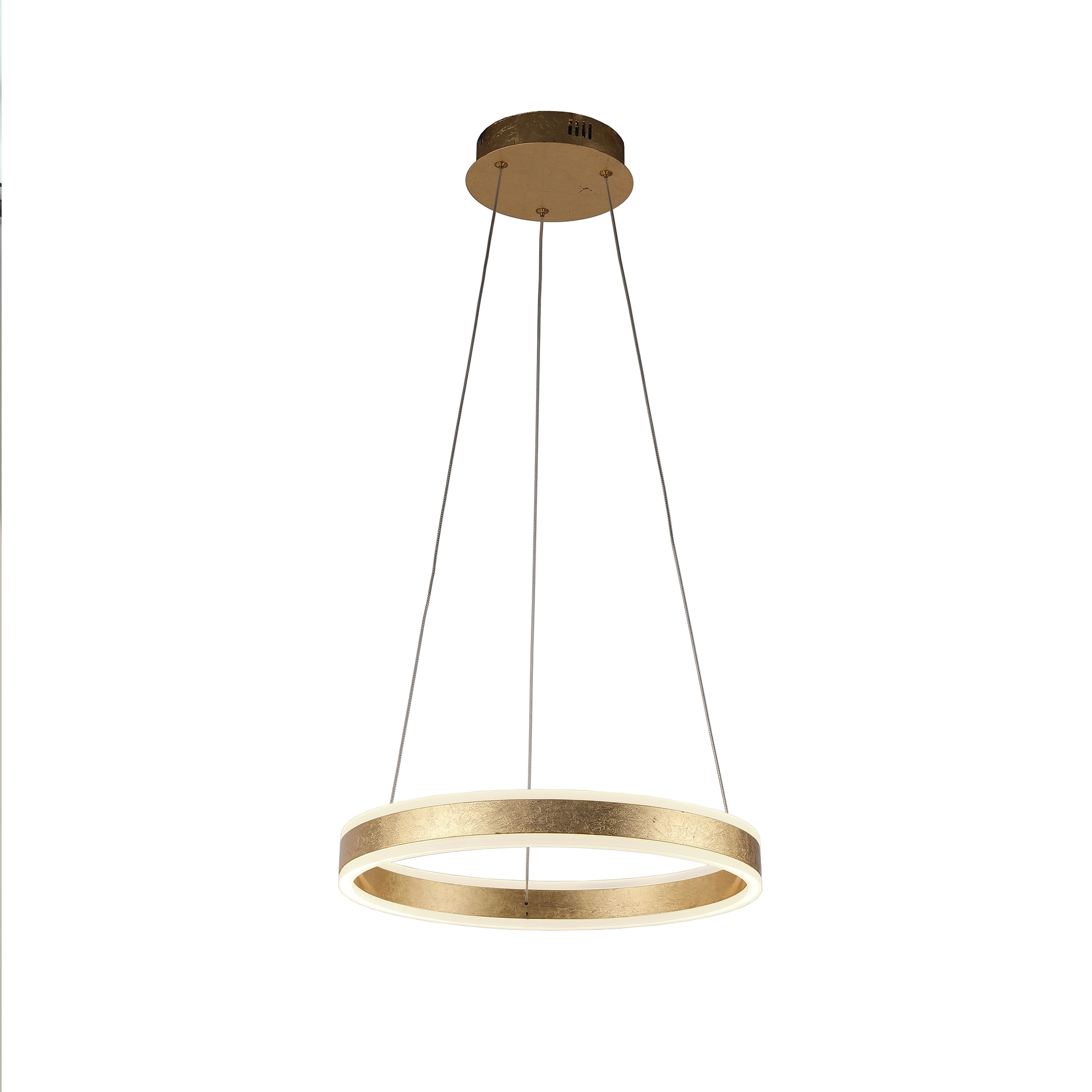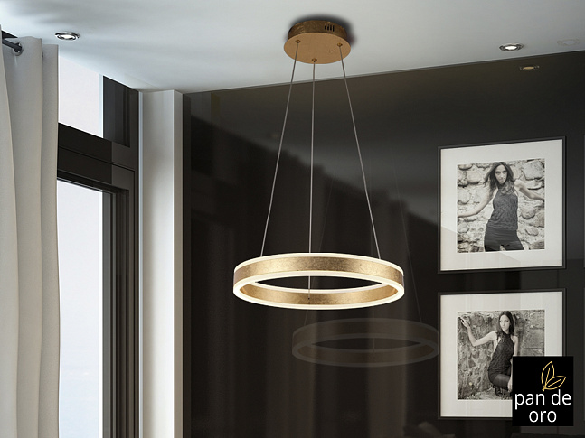 Подвесной светильник из металла и алюминия, покрытие из ЗОЛОТОЙ фольги. Обруч с акриловым рассеивателем опалового цвета. С регулируемой высотой. 55W LED, 3300 Lm, 3000 K.