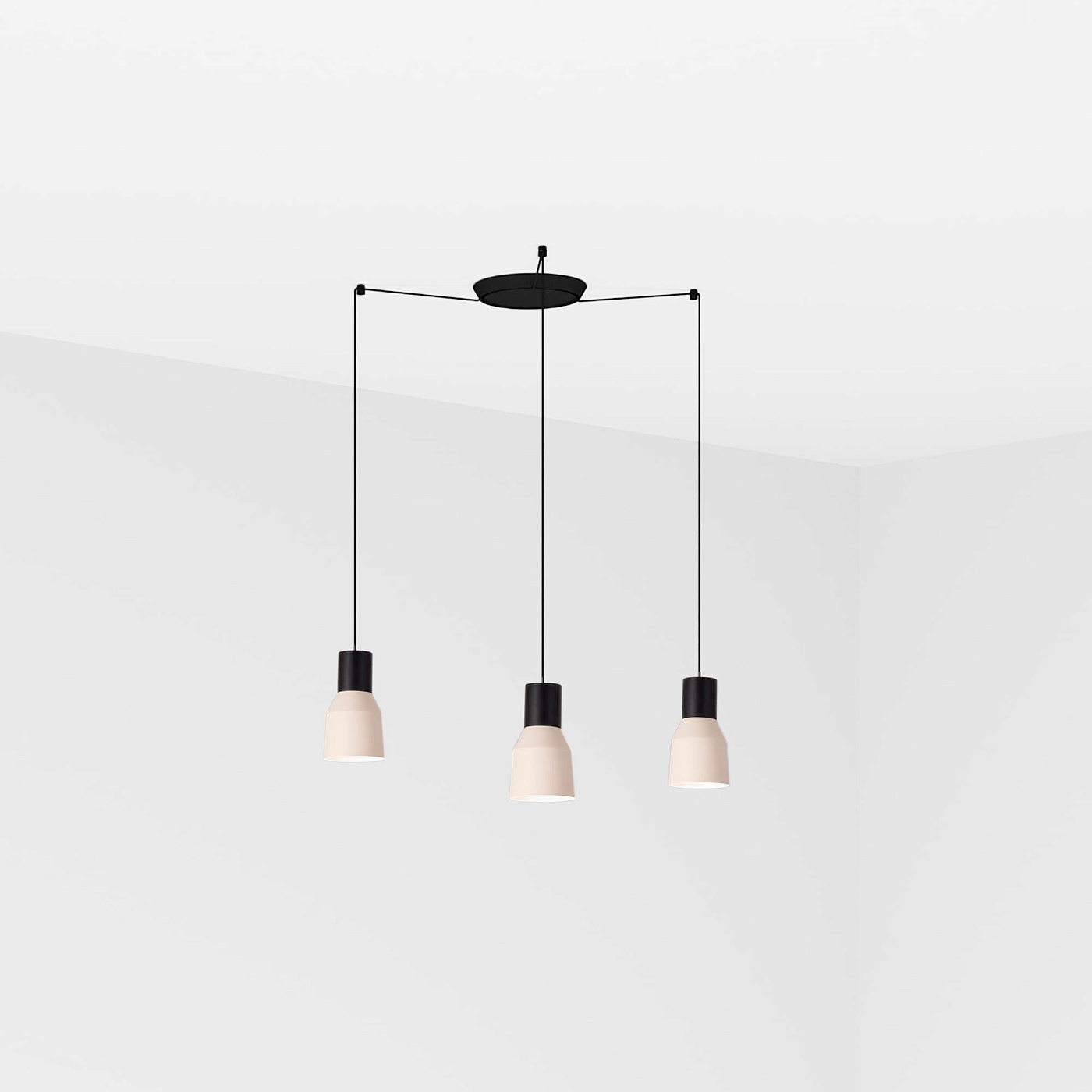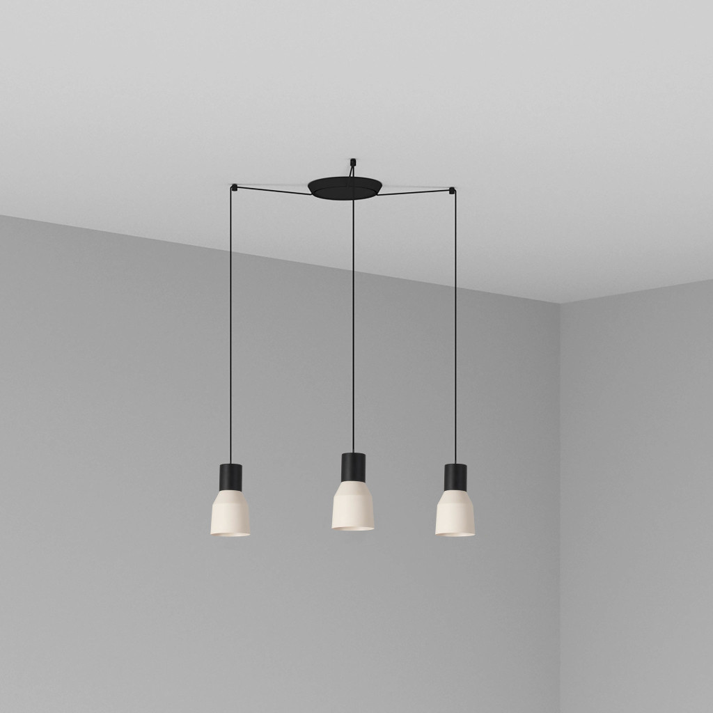 KOMBO — это семейство подвесных светильников, созданное Nutcreatives. Серия имеет разные размеры и отделку, которые имеют черную цилиндрическую структуру в верхней части. Абажур этого бежевого светильника выполнен из металла, выполнен в стиле минимализма и играет с геометрическими формами. Версия с многослойным 3-световым фонарем.