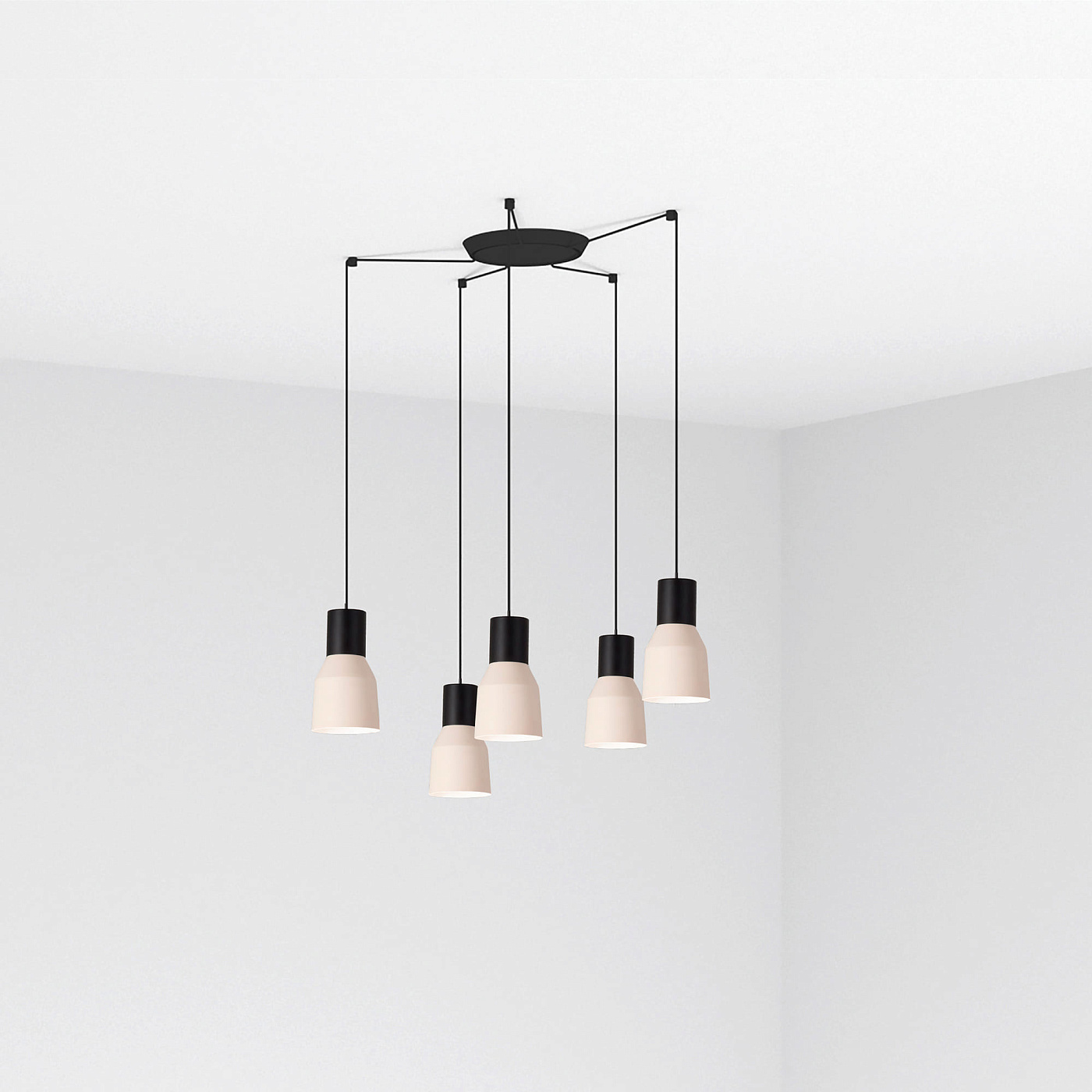 KOMBO — это семейство подвесных светильников, созданное Nutcreatives. Серия имеет разные размеры и отделку, которые имеют черную цилиндрическую структуру в верхней части. Абажур этого бежевого светильника выполнен из металла, выполнен в стиле минимализма и играет с геометрическими формами. Версия с многократным 5-световым фонарем.