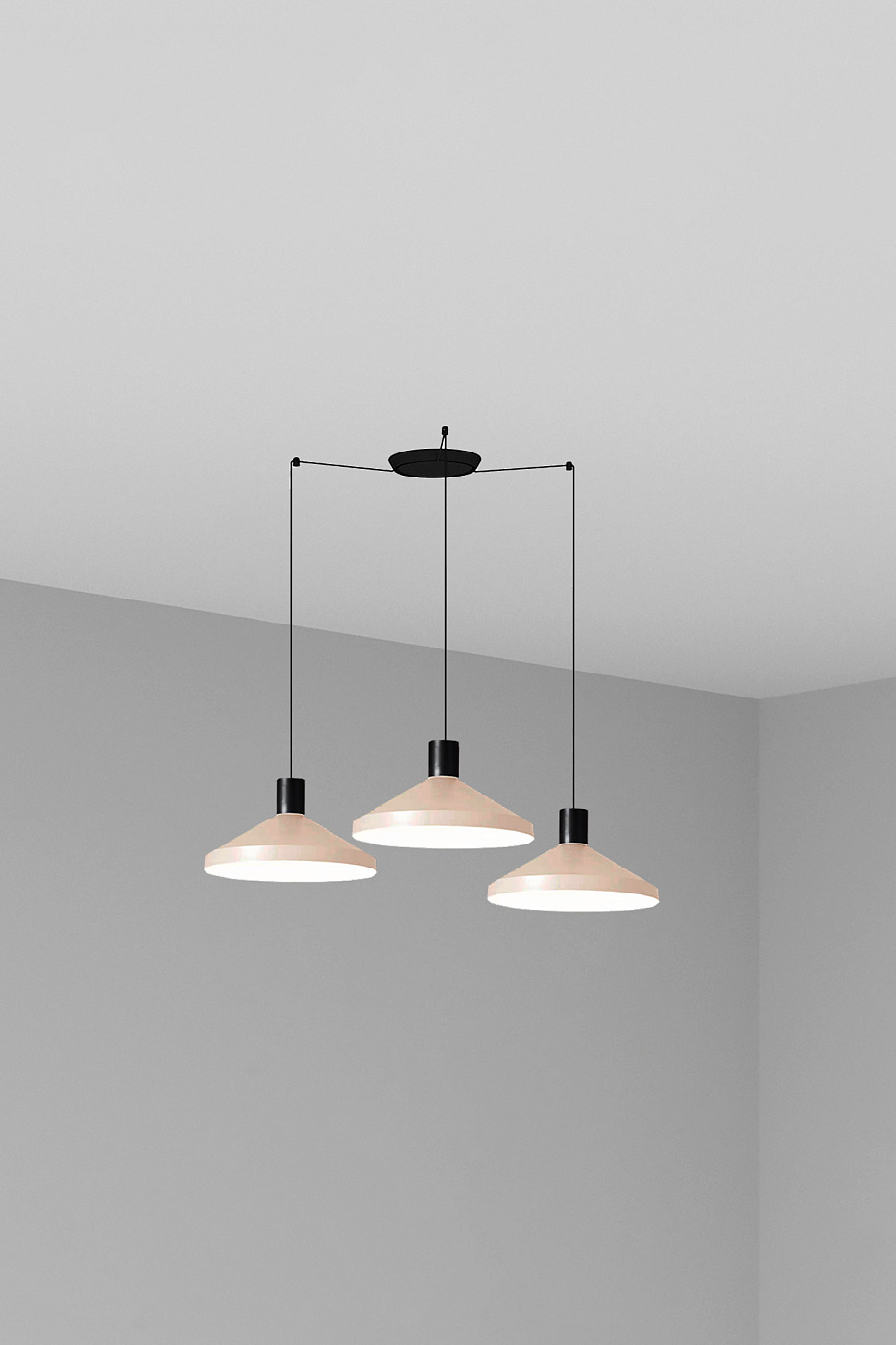 KOMBO — это семейство подвесных светильников, созданное Nutcreatives. Серия имеет разные размеры и отделку, которые имеют черную цилиндрическую структуру в верхней части. Абажур этого бежевого светильника выполнен из металла, выполнен в стиле минимализма и играет с геометрическими формами. Версия с многослойным 3-световым фонарем. Его диаметр составляет 40 см.