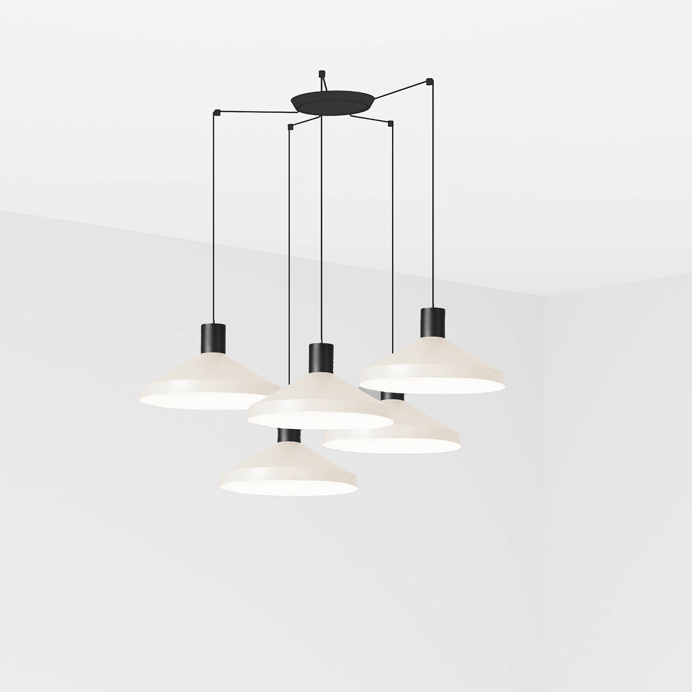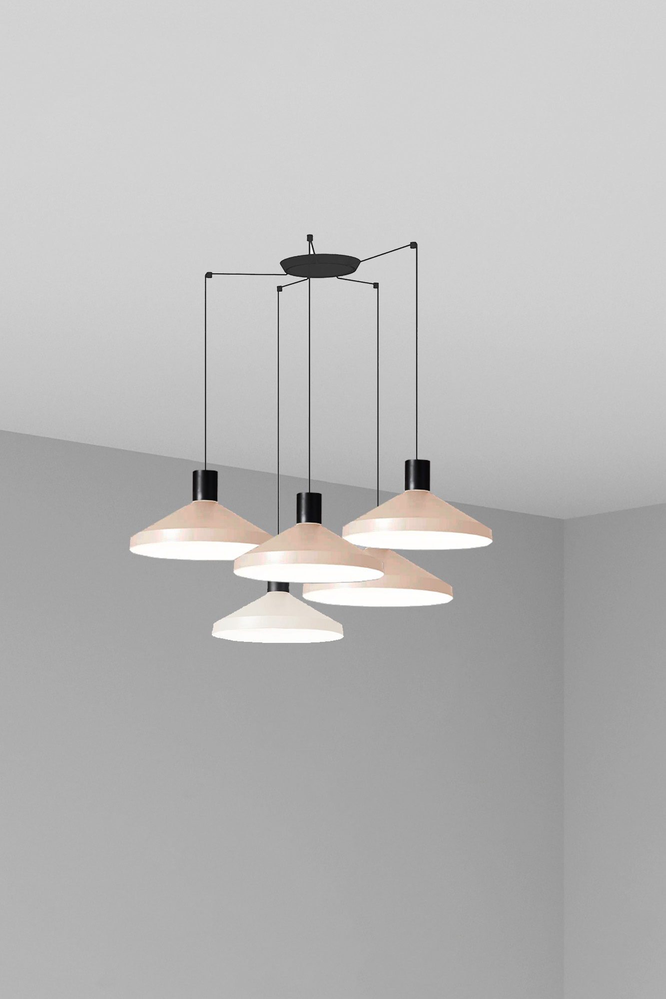 KOMBO — это семейство подвесных светильников, созданное Nutcreatives. Серия имеет разные размеры и отделку, которые имеют черную цилиндрическую структуру в верхней части. Абажур этого бежевого светильника выполнен из металла, выполнен в стиле минимализма и играет с геометрическими формами. Версия с 5 лампами. Его диаметр составляет 40 см.