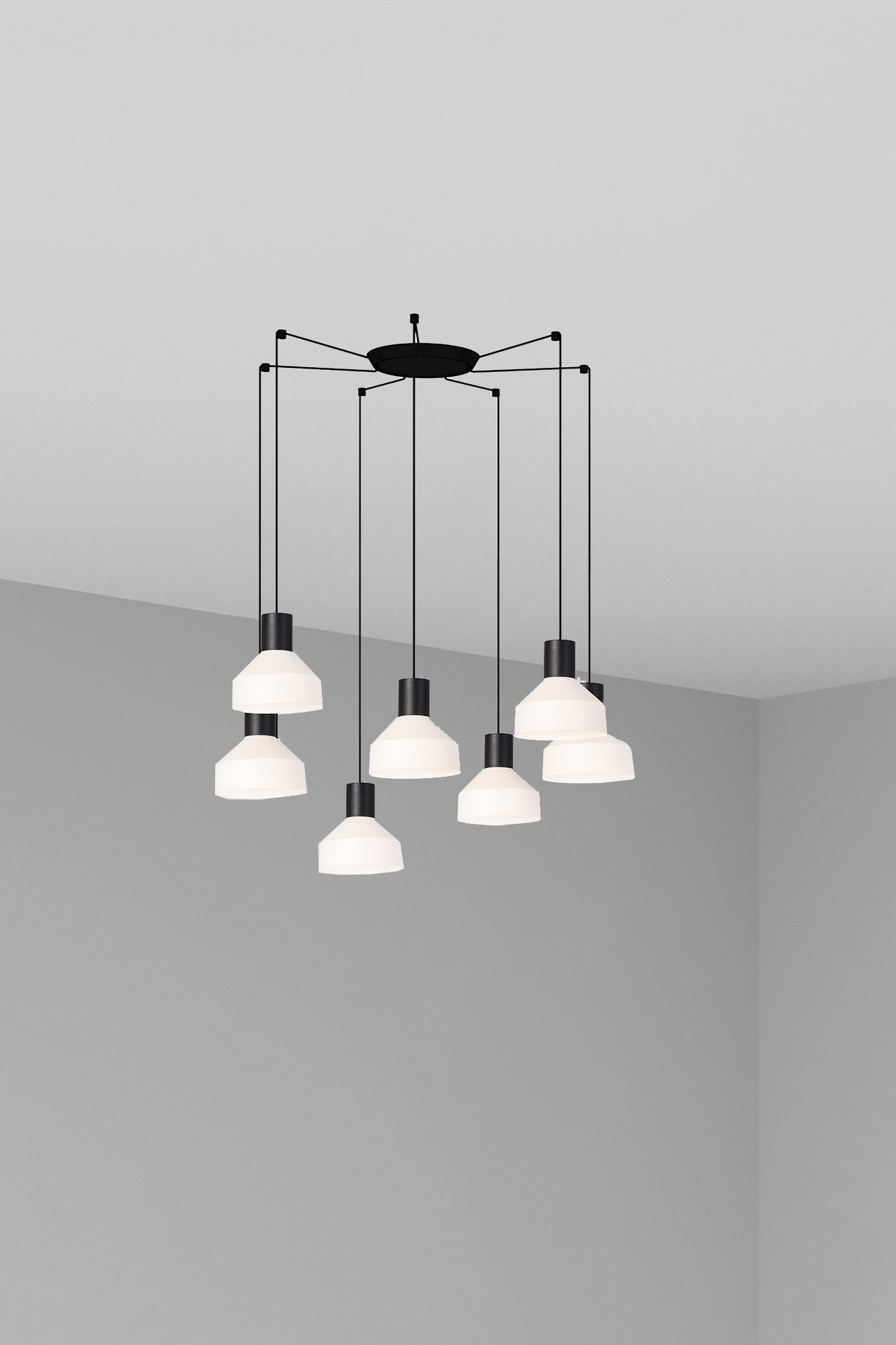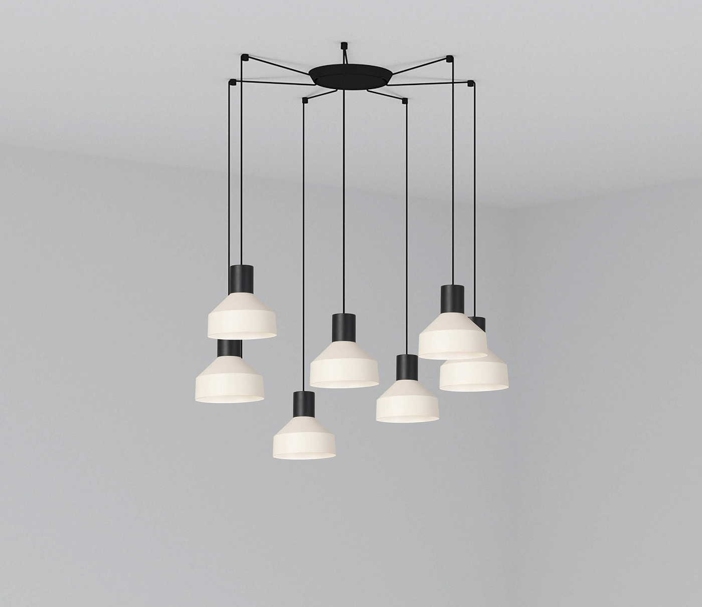 KOMBO — это семейство подвесных светильников, созданное Nutcreatives. Серия имеет разные размеры и отделку, которые имеют черную цилиндрическую структуру в верхней части. Абажур этого бежевого светильника выполнен из металла, выполнен в стиле минимализма и играет с геометрическими формами. Версия с многократным 7-световым фонарем. Его диаметр составляет 20 см.