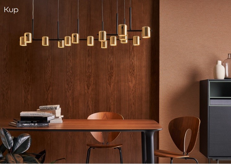 Регулируемая модульная подвесная система со светодиодами, которая позволяет создавать несколько композиций. Он продается в двух стандартных форматах: Куп 1 и Куп 2. Каждый из этих светильников состоит из пяти регулируемых осветительных блоков, дающих прямой свет. Структура светильника Kup выполнена в черном цвете, а корпуса светильников доступны в черном, золотом и медном цветах. Рассеиватели из матового опалового белого ПММА. Существует возможность поставки дополнительных модулей (модуля), состоящих из конструкции и двух световых головок, которые позволяют увеличить размеры светильника для адаптации к поверхности и пространству. Этот модуль можно вставить в любую из торцевых крышек стандартных светильников (Куп 1 и Куп 2).