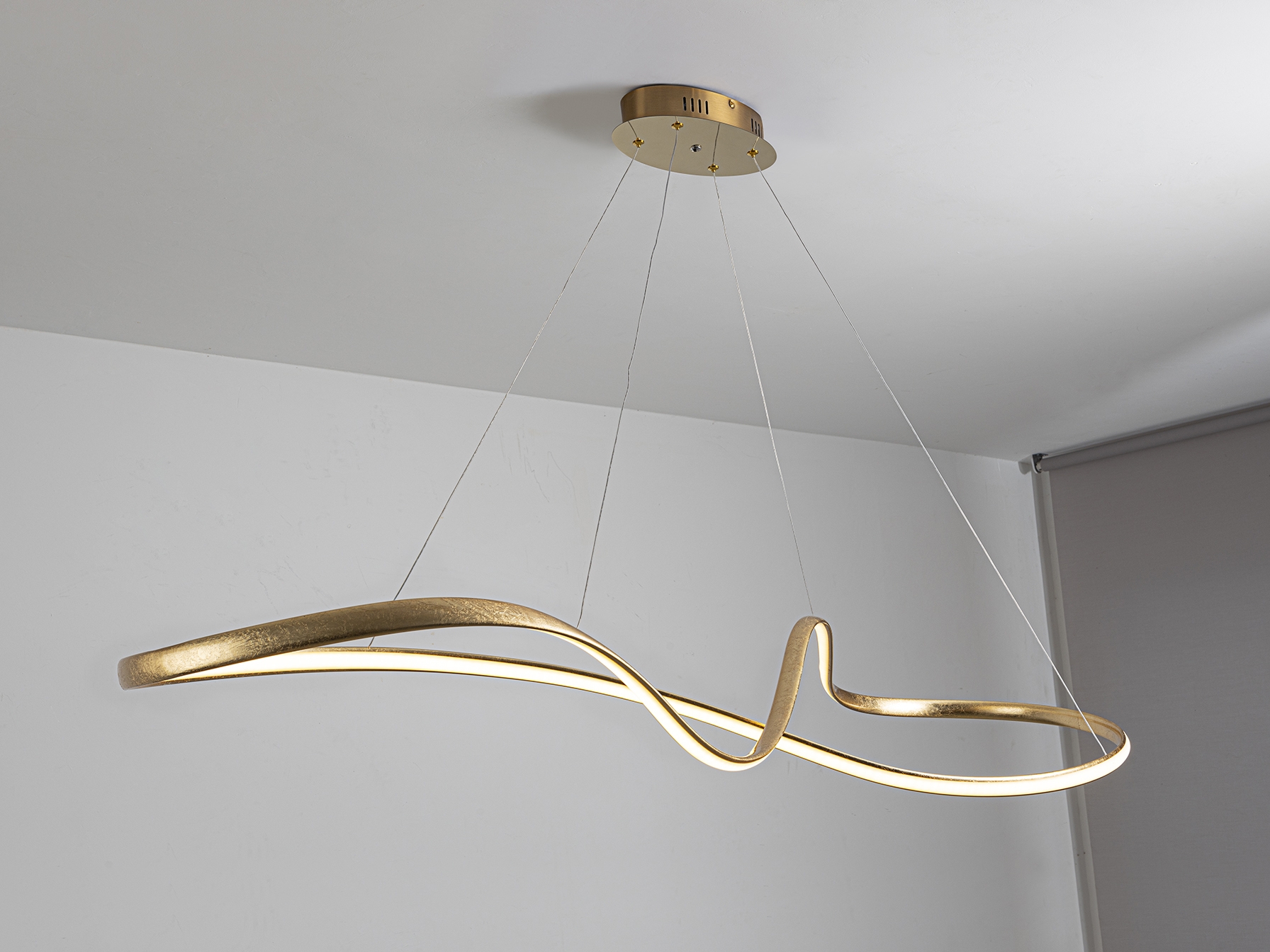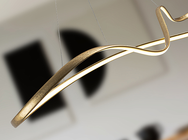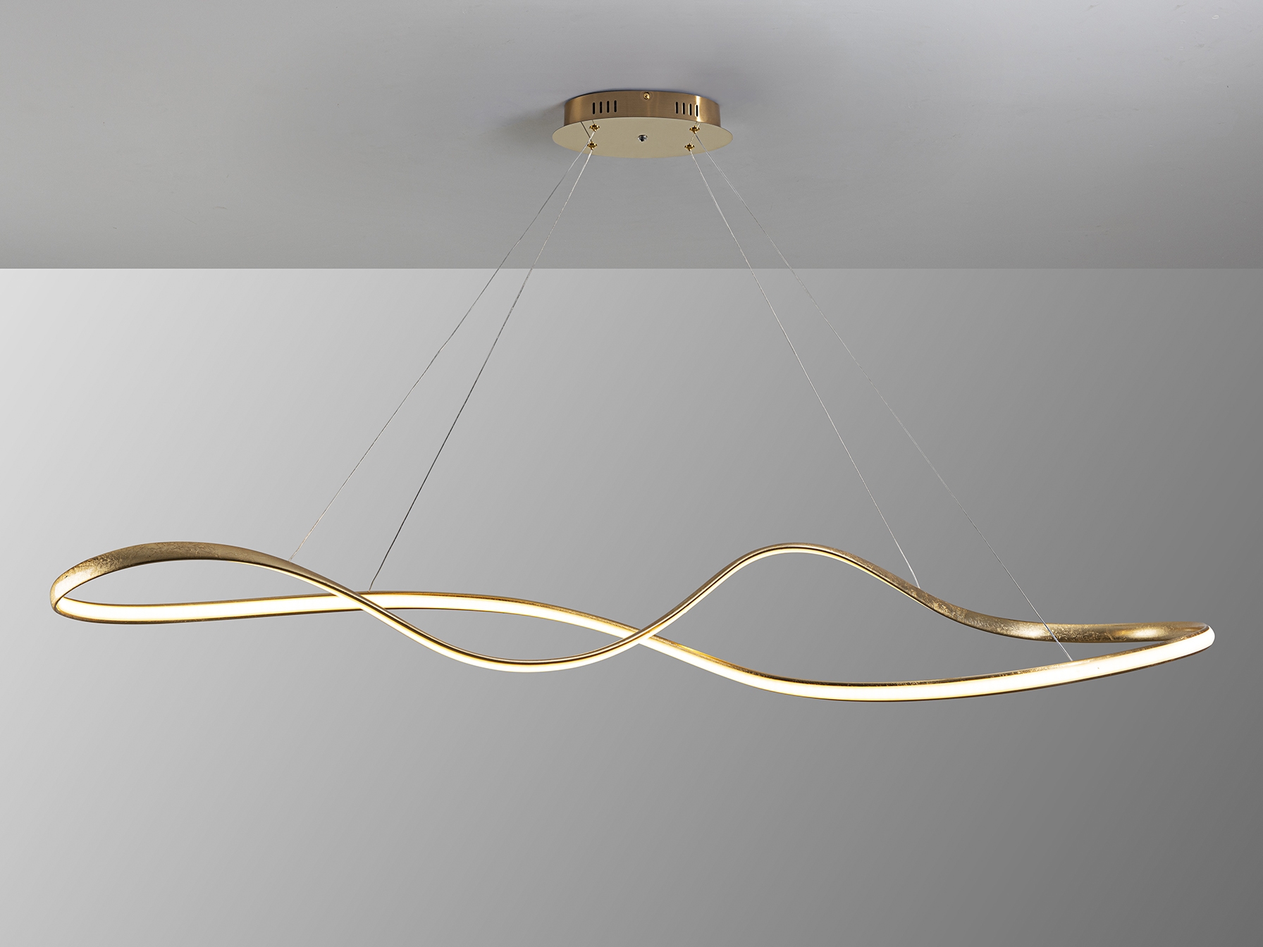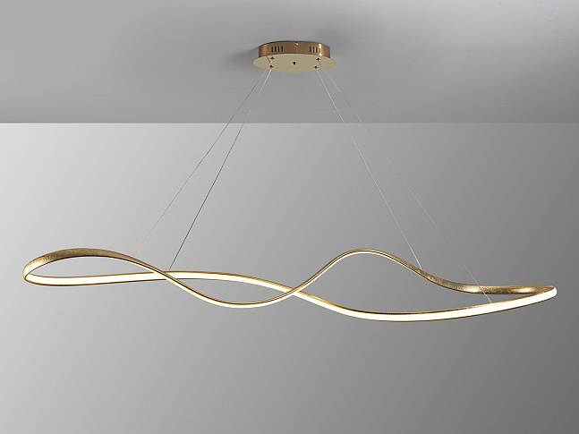 Лампа со светодиодной подсветкой, регулировкой яркости и изменением цвета CCT. Изготовлена из стали и алюминия, отделка GOLD LEAF и детали с блестящим золотым покрытием. Рассеиватель из опалового силикона. Регулируется по высоте. Светодиодное освещение 37 Вт, 2800 лм, 2700-5500 К. В комплект входит пульт дистанционного управления. В этом изделии используется диммер и инфракрасный пульт дистанционного управления для регулировки интенсивности и цветовой температуры. · Эта лампа оснащена ГРАВИТАЦИОННЫМИ ПЕРЕКЛЮЧАТЕЛЯМИ для улучшения фиксации на потолке.