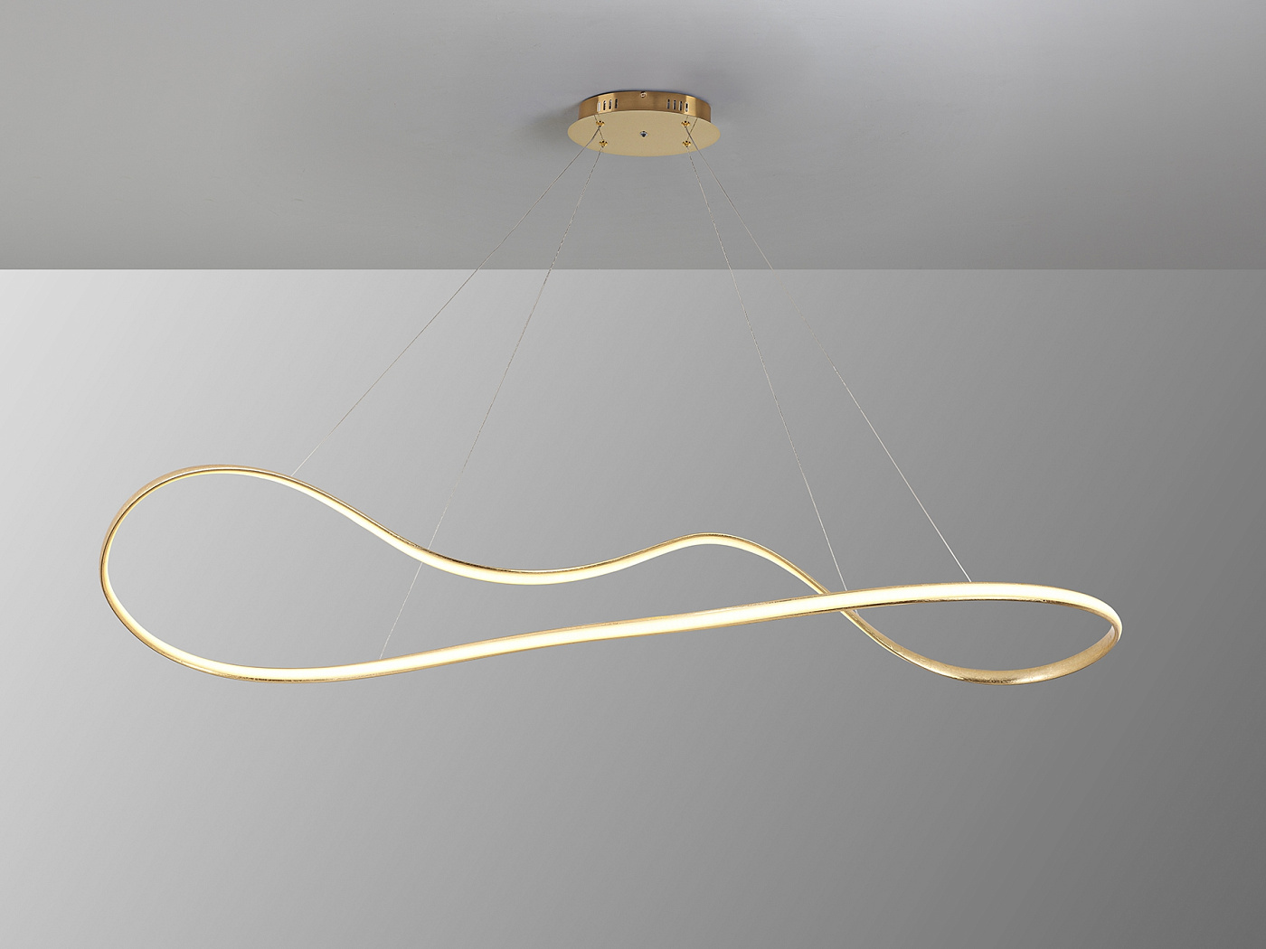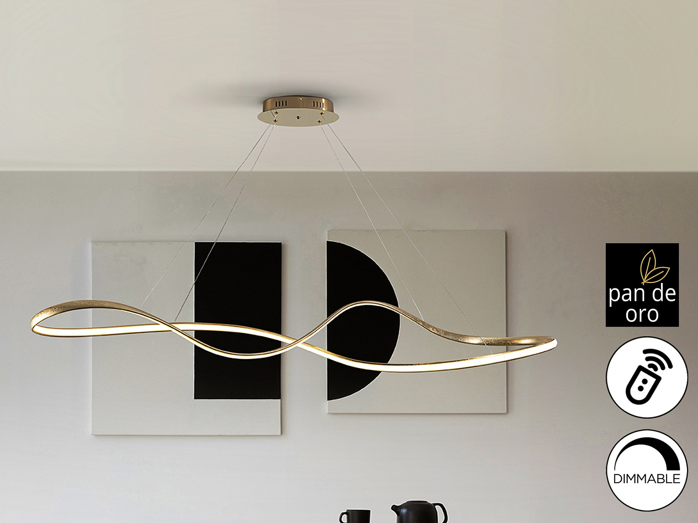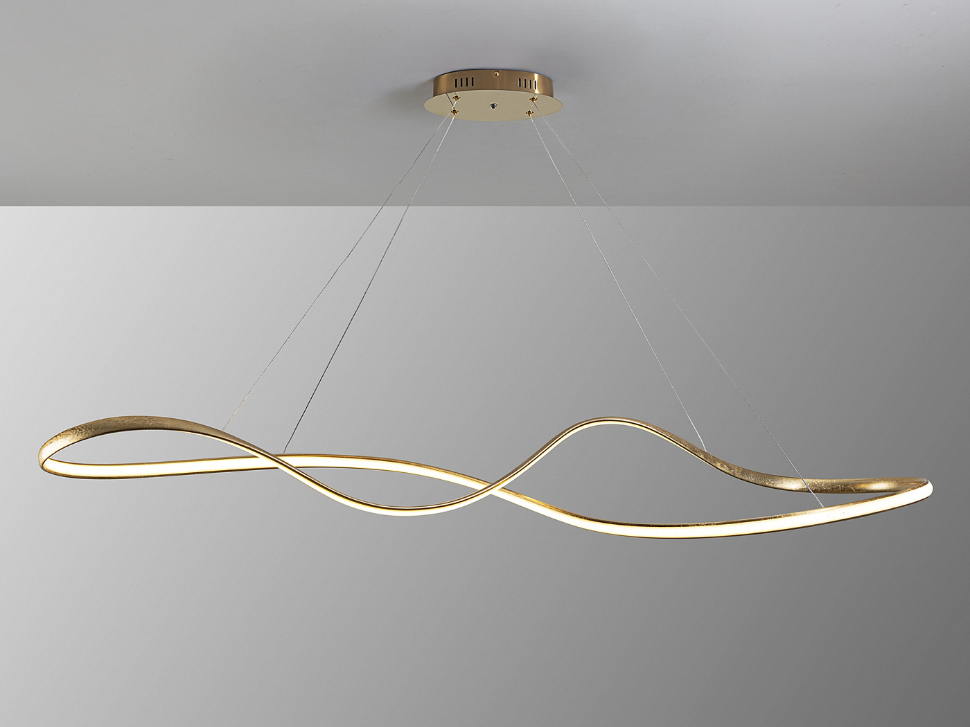 Лампа со светодиодной подсветкой, регулировкой яркости и изменением цвета CCT. Изготовлена из стали и алюминия, отделка GOLD LEAF и детали с блестящим золотым покрытием. Рассеиватель из опалового силикона. Регулируется по высоте. Светодиодное освещение 37 Вт, 2800 лм, 2700-5500 К. В комплект входит пульт дистанционного управления. В этом изделии используется диммер и инфракрасный пульт дистанционного управления для регулировки интенсивности и цветовой температуры. · Эта лампа оснащена ГРАВИТАЦИОННЫМИ ПЕРЕКЛЮЧАТЕЛЯМИ для улучшения фиксации на потолке.