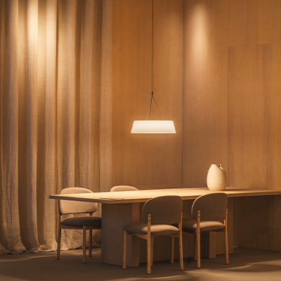 Подвесная версия Lily характеризуется полупрозрачным стеклянным рассеивателем, скрывающим круглый светодиодный источник света. В подвесном варианте Lily спускается с потолка с воздушным воздухом, а ее микротонкие кабели добавляют дизайну ощущение невесомости.