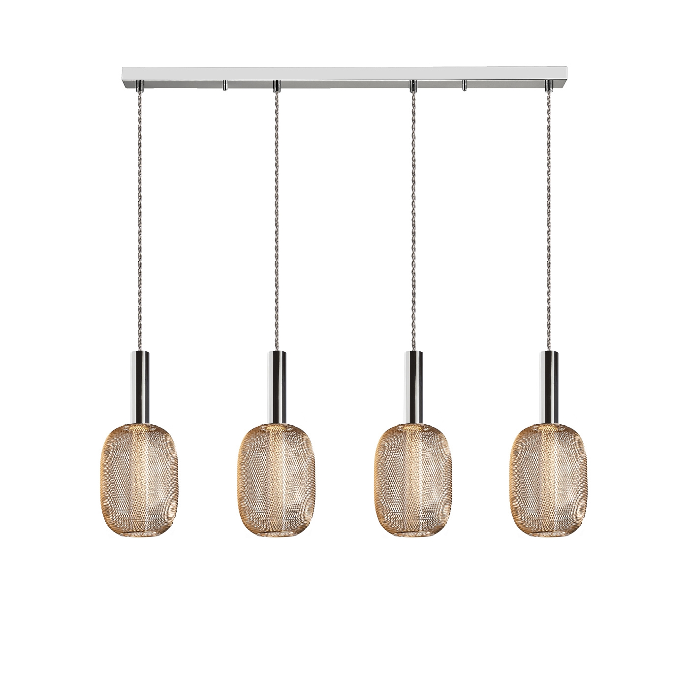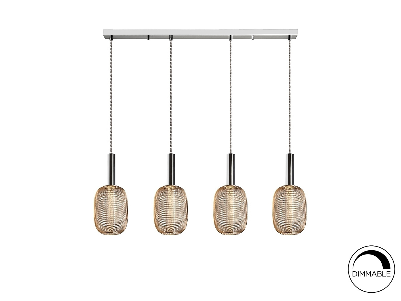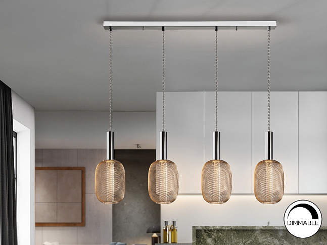 Светодиодный светильник на 4 лампы из хромированного металла. Двойной плафон с внутренним прозрачным акриловым цилиндром с пузырьками и внешним овалом из металлической сетки яркого золота. 20W LED, 1800 lm, 3.000 K. DIMMABLE.