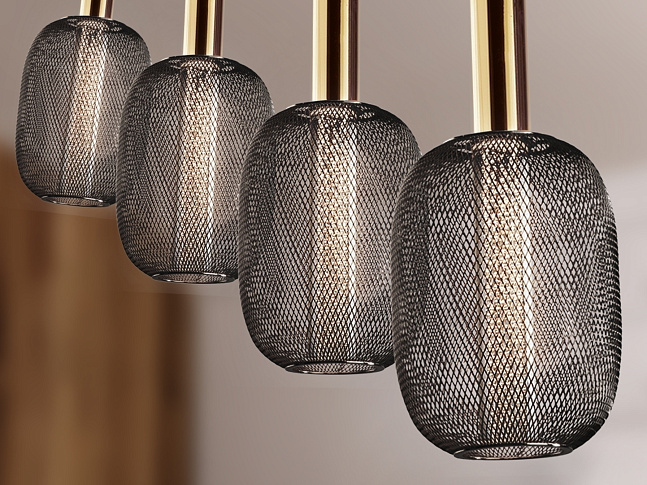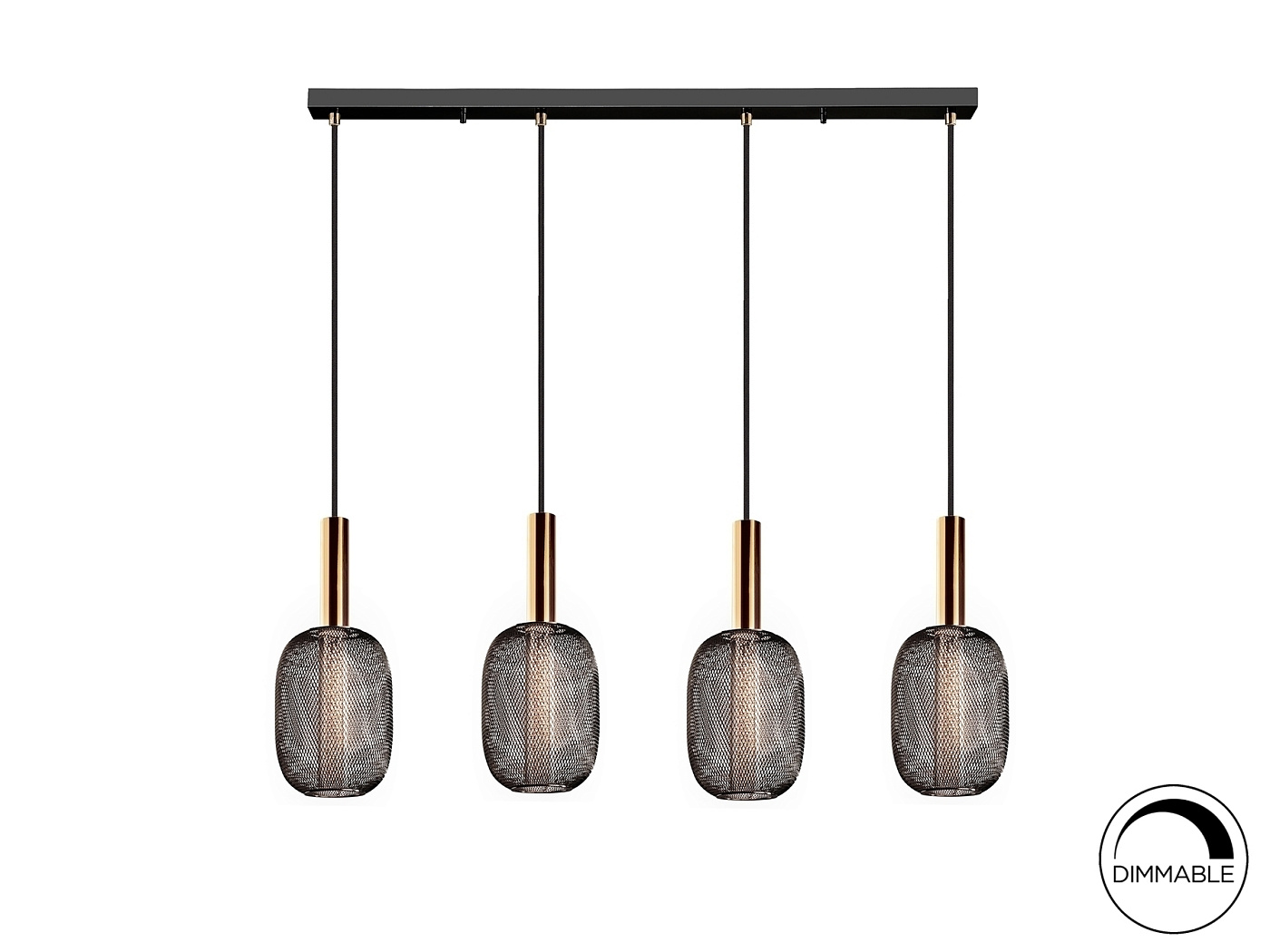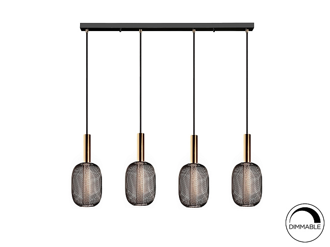 Светодиодный светильник из 4 лампочек из металла яркого золота и черного цвета. Двойной оттенок с внутренним прозрачным акриловым цилиндром с пузырьками и внешним овалом из металлической сетки черного цвета. Светодиод мощностью 20 Вт, 1800 лм, 3000 К. С РЕГУЛИРОВКОЙ РЕГУЛЯЦИИ. Этот продукт можно затемнить с помощью специального светодиодного настенного диммера. · Эта лампа поставляется с ГРАВИТАЦИОННЫМИ ПЕРЕКЛЮЧАТЕЛЯМИ для улучшения крепления к потолку.