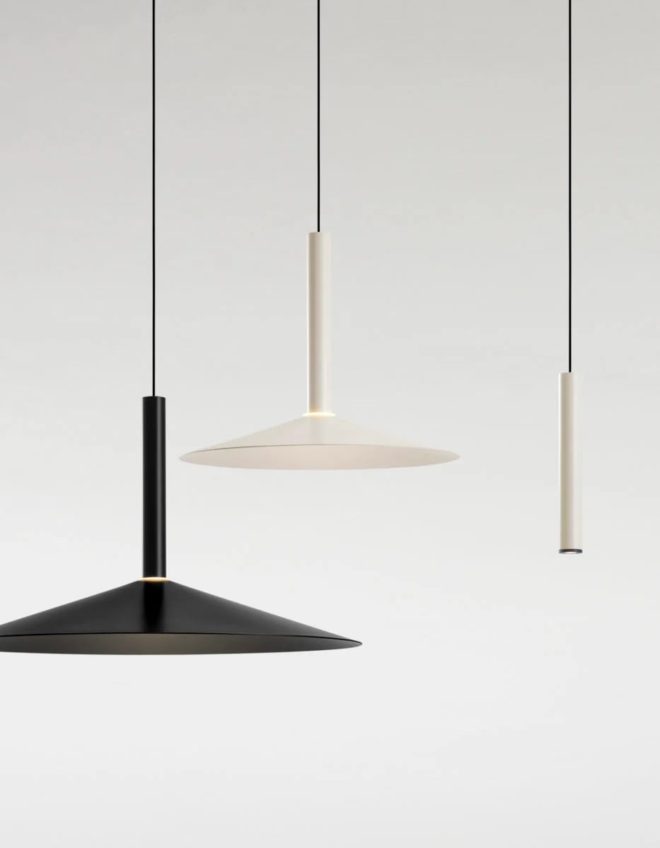 Парадоксально, но этот новый дизайн начинается с деконструкции архетипа лампы; максимально синтезируя его, остается только цилиндрический корпус со встроенным светодиодом. К этому цилиндру мы можем добавить различные конусообразные плафоны в устрично-белом и черном цветах нескольких размеров. Но самым оригинальным из всего этого является то, что каждая из этих ламп может иметь простой противовес, так что, когда они подвешены между двумя точками, их можно перемещать.