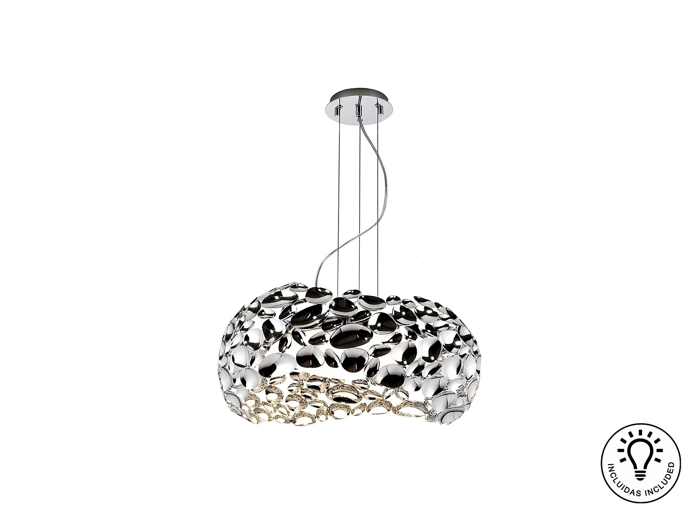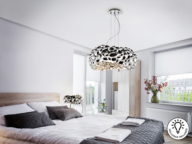 Подвесной светильник с 5 лампами, из хромированного металла, акриловый рассеиватель внутри, с регулируемой высотой. Включает 5 светодиодов G9 мощностью 6 Вт.