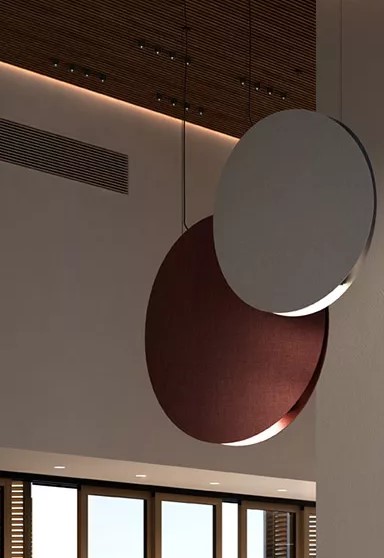 Noren получил свое название от кусочков ткани, которые традиционно использовались в качестве занавесок в японских домах, чтобы разделить различные области, заменяя стены, двери или окна. Вдохновленные этой японской традицией, Noren представляют собой легкие декоративные световые конструкции со звукопоглощающими панелями, которые в сочетании друг с другом помогают координировать пространство за счет интеграции звука и света.