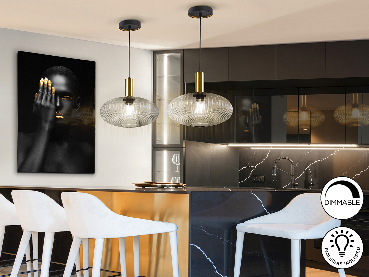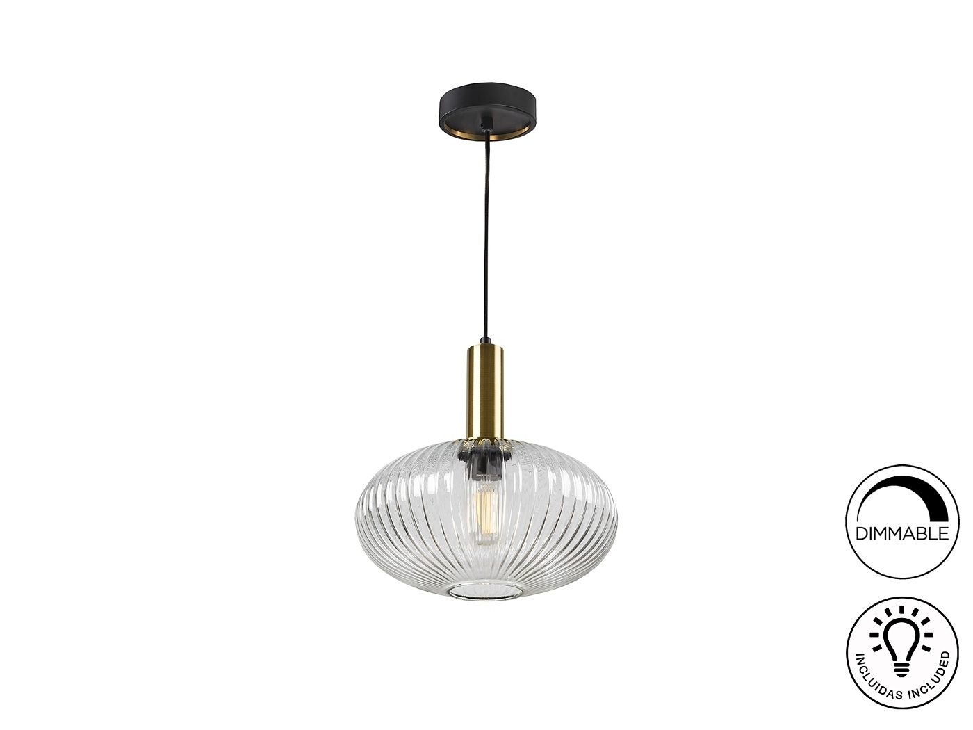 Лампа с 1 лампочкой из металла, окрашенного в черный матовый цвет, с деталями из сатинированной латуни. Абажур из прозрачного формованного стекла. Регулируется по длине.