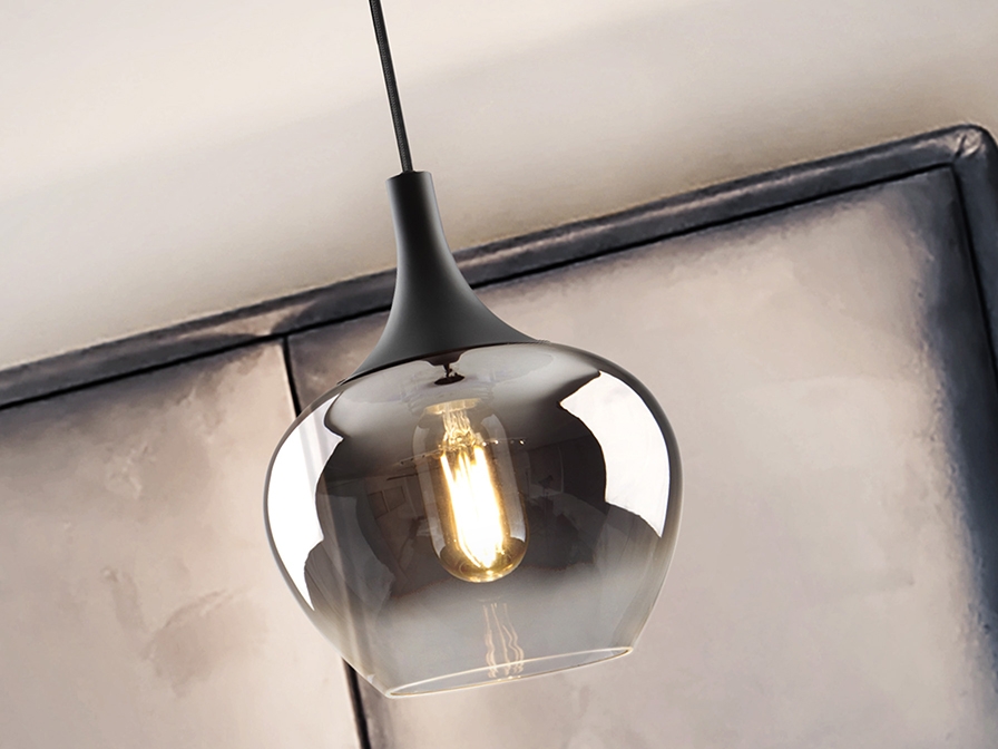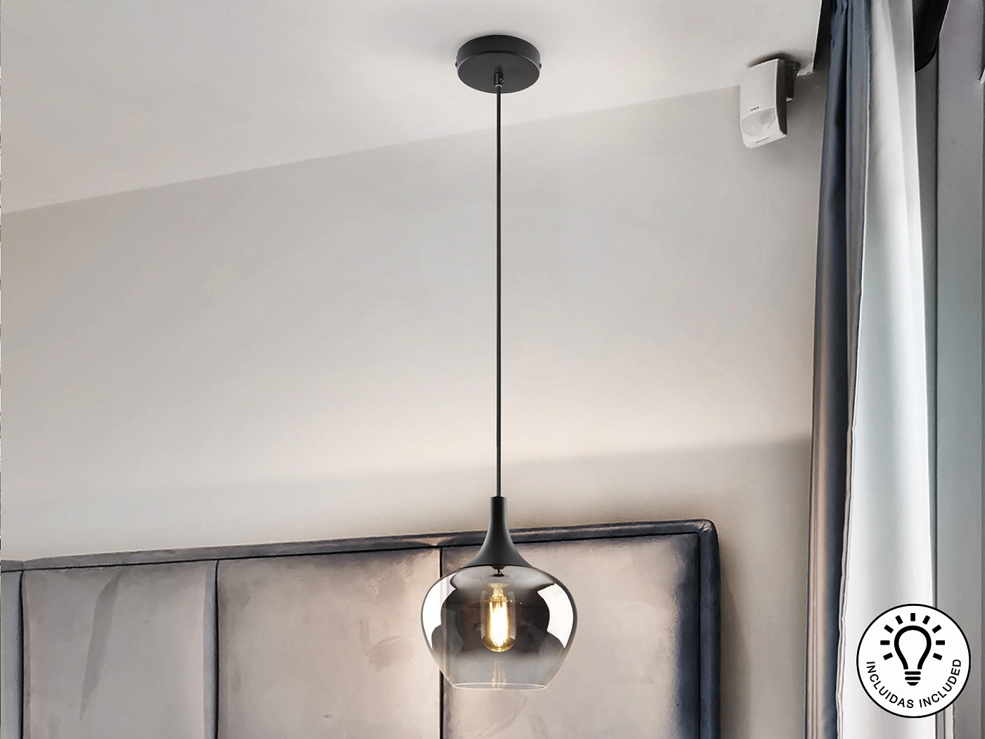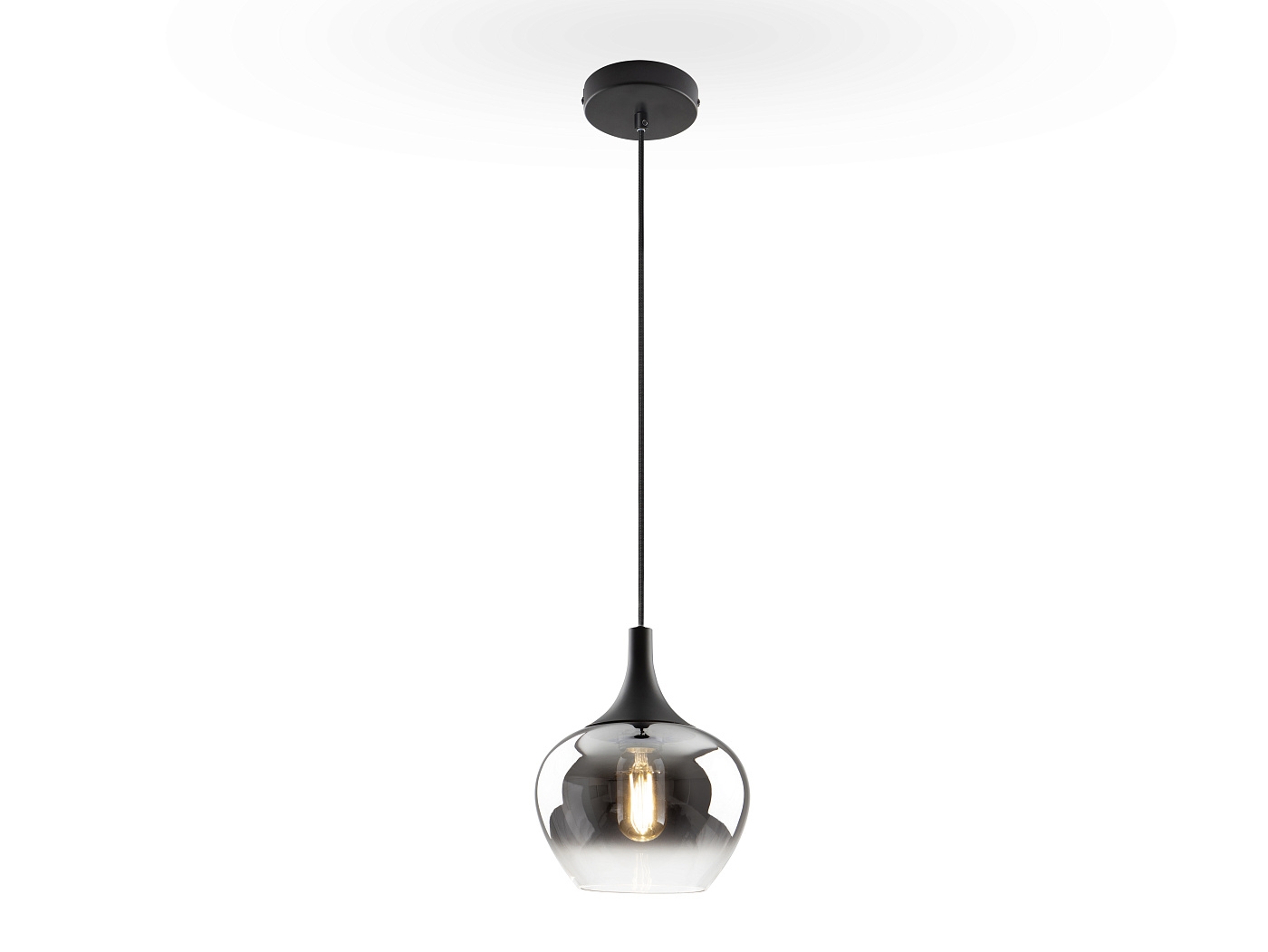 Лампа на 1 лампу, металлическая, матово-черная отделка. Абажур из деградированного дымчатого стекла диаметром 19 см. Регулируемая высота. ·В комплект поставки входит 1 светодиод E27 мощностью 8 Вт. РЕГУЛИРУЕМАЯ ЯРКОСТЬ. Эта лампа оснащена ГРАВИТАЦИОННЫМИ ПЕРЕКЛЮЧАТЕЛЯМИ для улучшения фиксации на потолке.