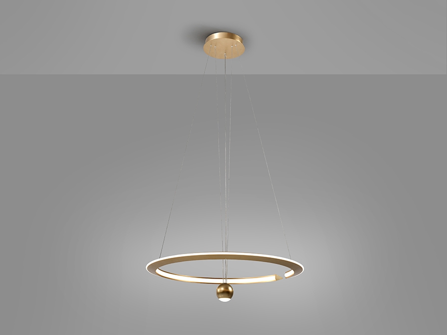 Светильник из стали и матового алюминия, анодированное золото. Рассеиватель из опалового силикона. Позволяет вручную регулировать высоту, потянув за центральный шар. РЕГУЛИРУЕМАЯ ЯРКОСТЬ, светодиод 46 Вт, 3400 лм, 3000 К. Драйвер TRIAC и НАБОР РЕГУЛИРОВКИ входят в комплект. В этом изделии используется светодиодный драйвер с симистором и регулировкой яркости 0–10 В, в комплект входит набор диммера с диммером и радиочастотным пультом дистанционного управления, или его можно регулировать с помощью симистора или настенного диммера 0–10 В. · Эта лампа поставляется с ГРАВИТАЦИОННЫМИ ПЕРЕКЛЮЧАТЕЛЯМИ для улучшения крепления к потолку.