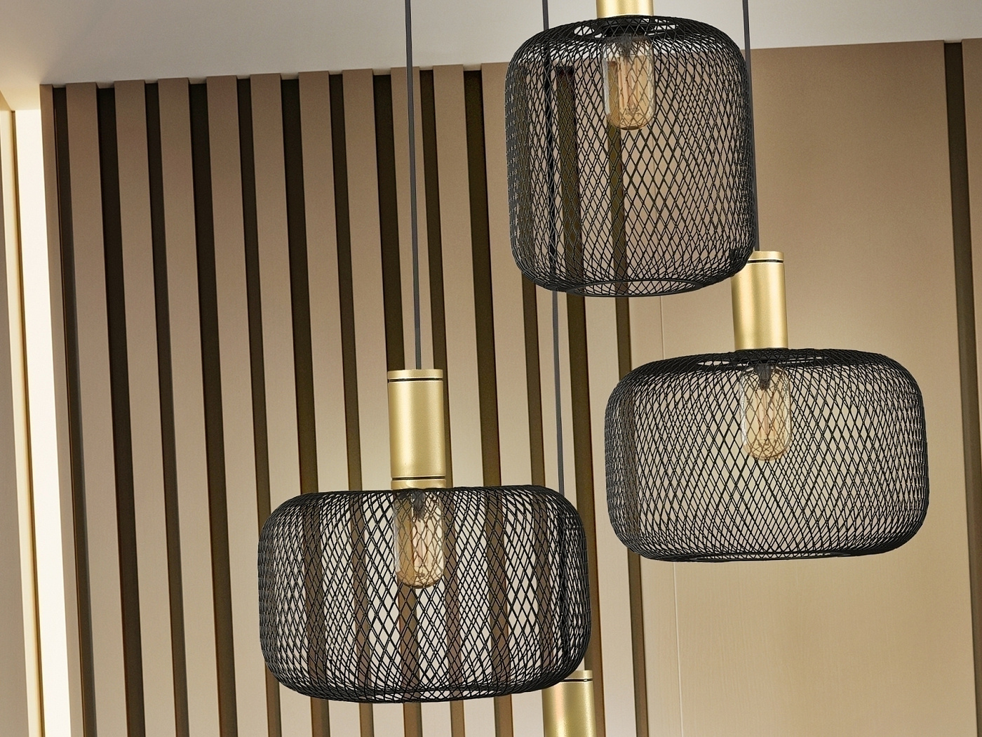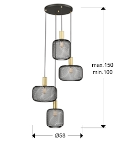 Круглый светильник из 4 ламп из металла. Включает в себя 2 дизайна металлических сетчатых абажуров. Матовая черно-золотая окраска. Кабель в черной текстильной оболочке. ·Этот товар включает в себя 4 светодиода E27 мощностью 8 Вт. DIMABLE.