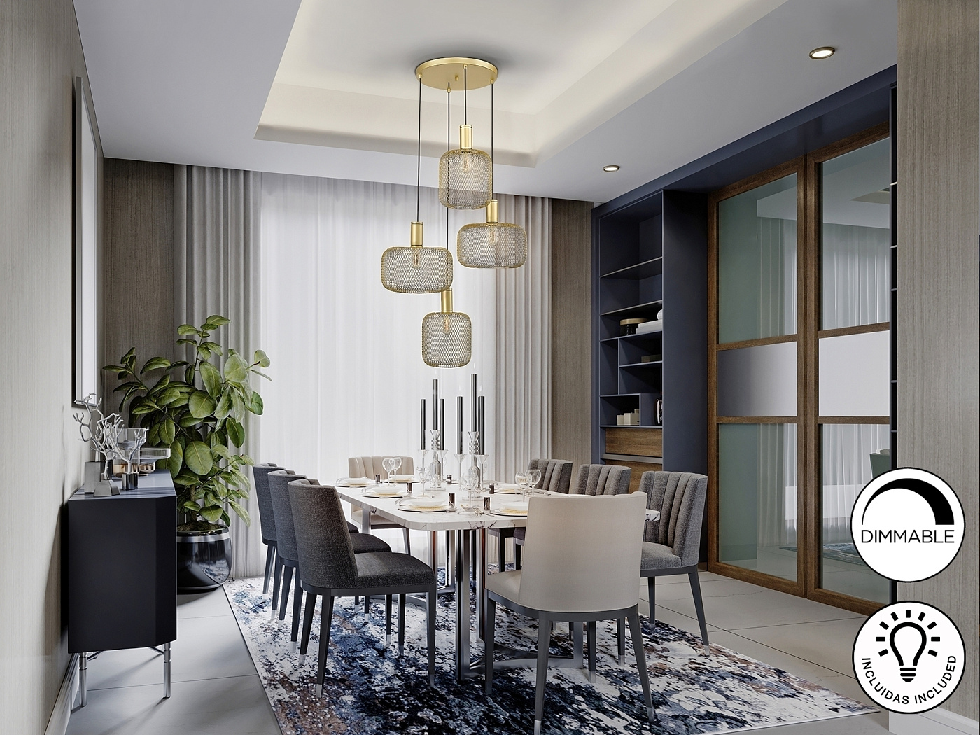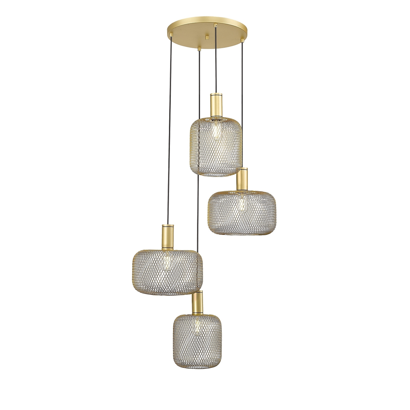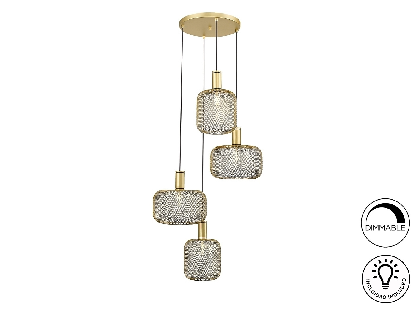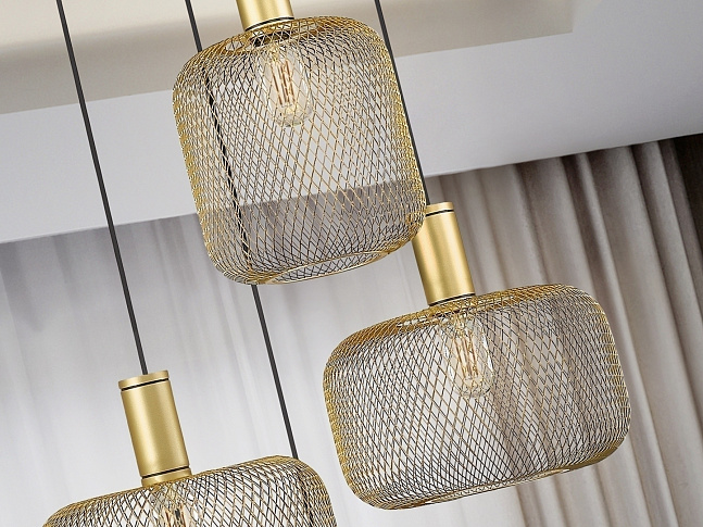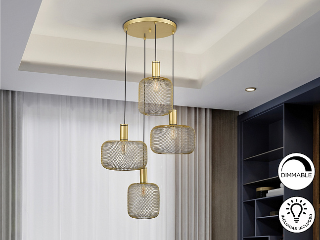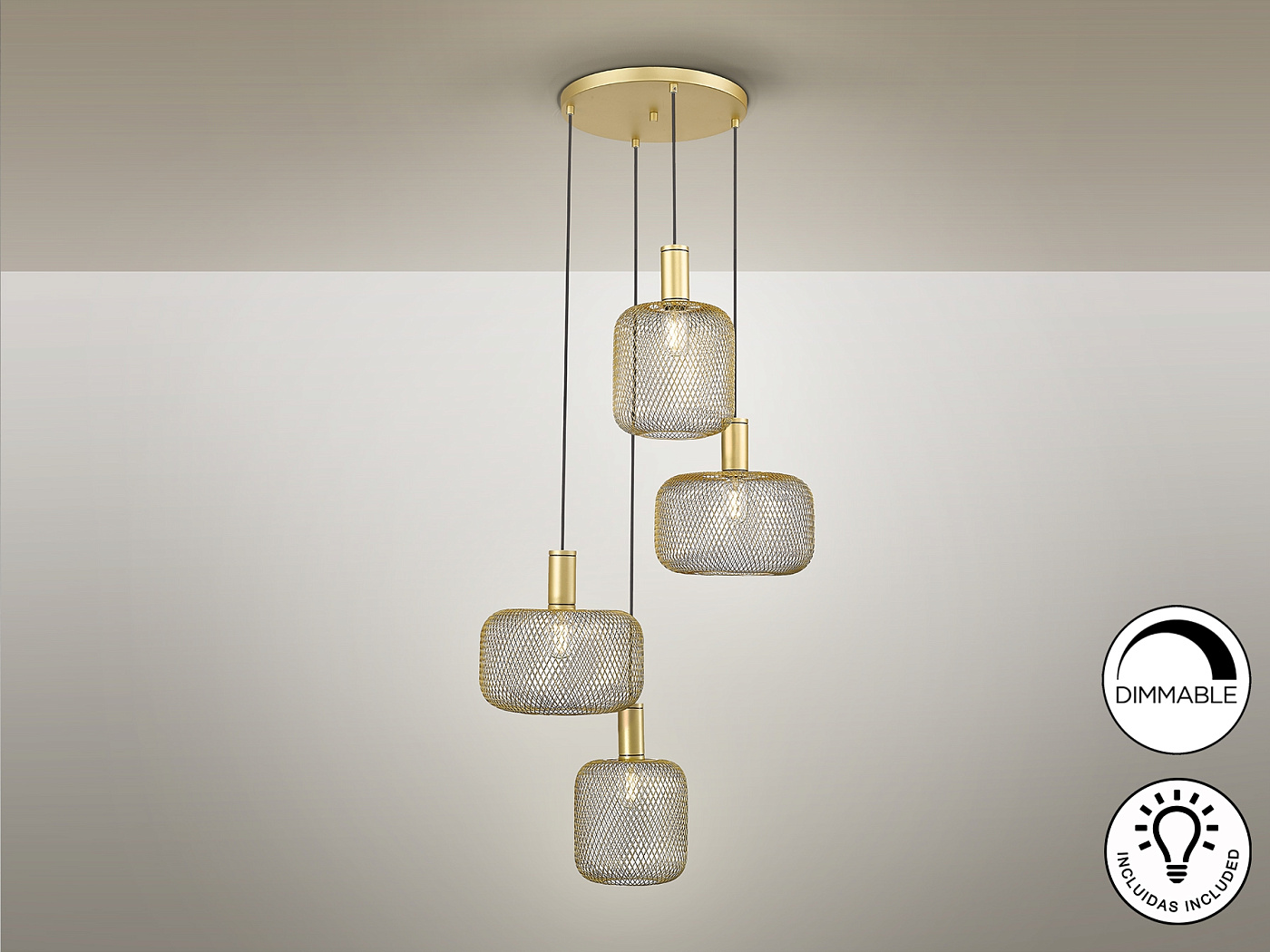 Круглый светильник из 4 ламп из металла. Включает в себя 2 дизайна металлических сетчатых абажуров. Золотая покраска. Кабель в черной текстильной оболочке. ·Этот товар включает в себя 4 светодиода E27 мощностью 8 Вт. DIMABLE.