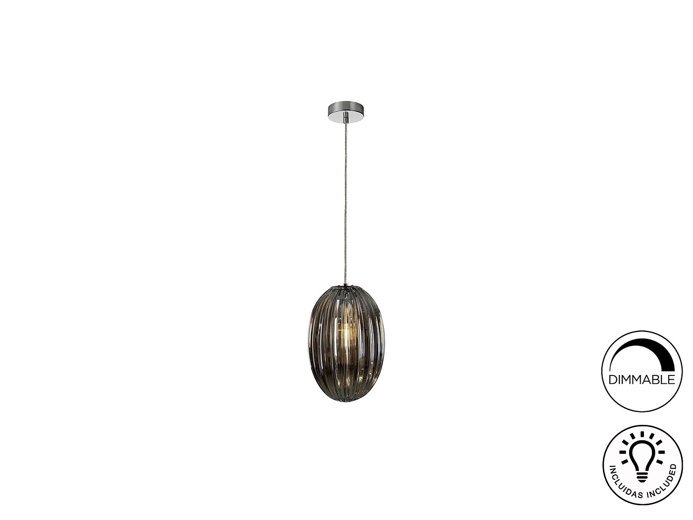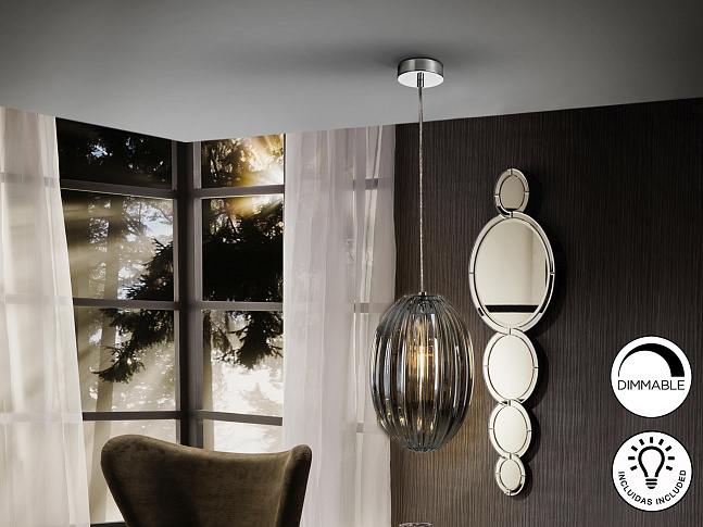 Подвесной светильник с 1 лампой, из металла с покрытием "хром". Маленький плафон из стекла дымчато-зеркального цвета. С регулируемой высотой. Включает 1 светодиод E27 мощностью 8 Вт. Диммируемый.