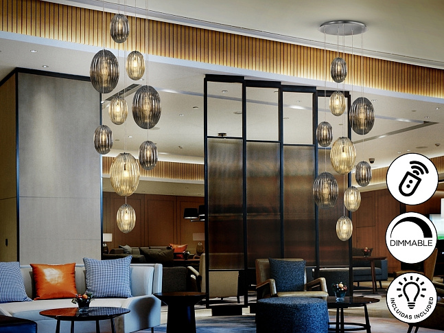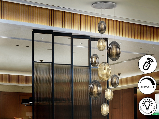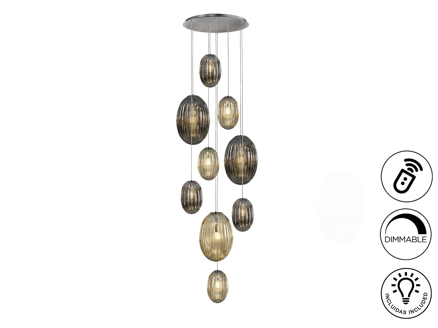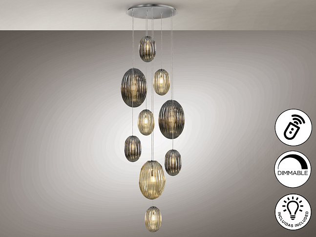 Подвесной светильник с 9 лампами, из металла с покрытием "хром". Маленькие и большие плафоны из стекла дымчато-зеркального цвета и янтарного цвета. С регулируемой высотой. Диммируемый. В комплекте с пультом ДУ. Этот продукт включает в себя диммер приемника и радиочастотный пульт дистанционного управления. · Включает 9 светодиодов E27 мощностью 8 Вт.