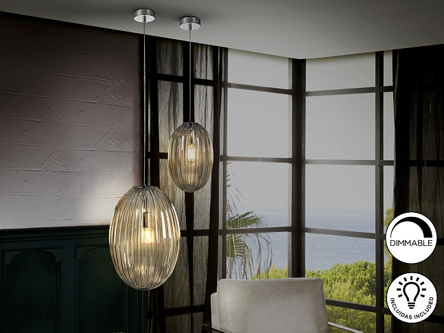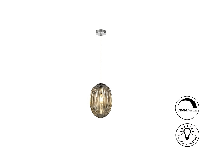 Подвесной светильник с 1 лампой, из металла с покрытием "хром". Маленький плафон из стекла янтарного цвета. С регулируемой высотой. Включает 1 светодиод E27 мощностью 8 Вт. Диммируемый.